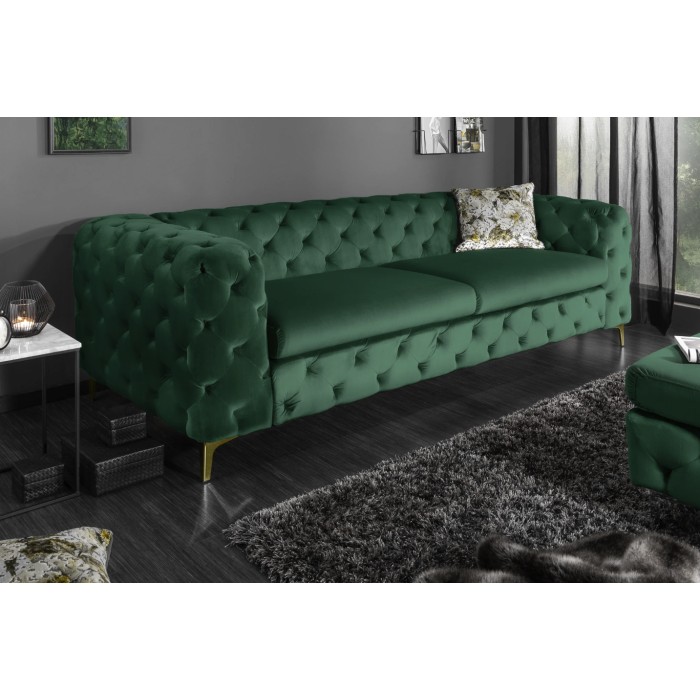 Canapé droit VELENA vert émeraude – Canapé baroque en velours avec pieds métal dorés