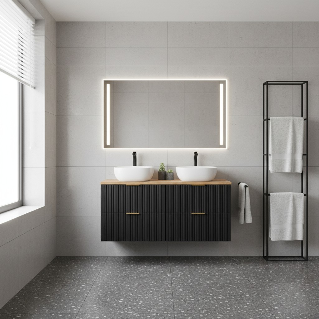 Avec sa finition noir mat associée au chêne wotan, cet ensemble NOXERA joue sur les contrastes pour un rendu contemporain et élégant. Son style épuré s’intègre parfaitement dans les salles de bain modernes tout en conservant une touche chaleureuse grâce à l’aspect bois.