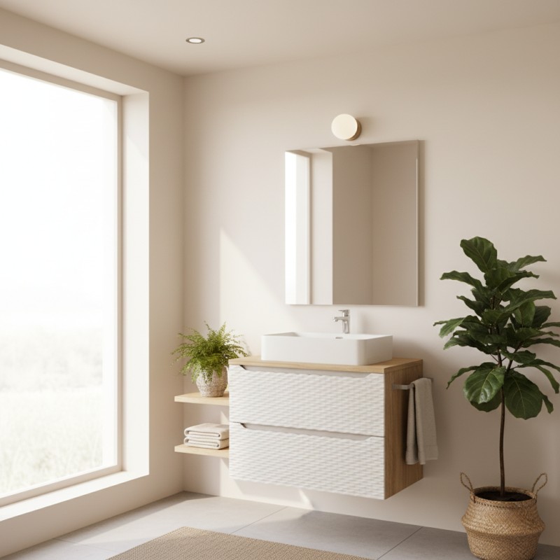 L’ensemble de salle de bain YOKA 80 cm séduit par son design raffiné et son format fonctionnel. Avec sa vasque à poser en céramique blanche et son meuble suspendu à deux tiroirs, il allie esthétisme, praticité et durabilité. Sa finition chêne clair et beige mat crée une ambiance naturelle et apaisante, parfaite pour les intérieurs modernes.