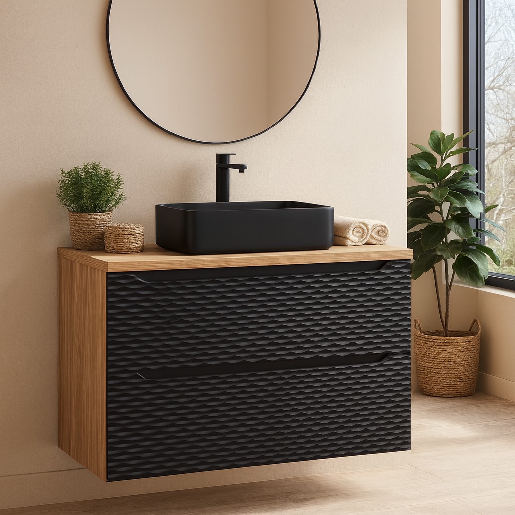 Apportez une touche de sophistication à votre salle de bain avec cet ensemble YOKA 90 cm noir, composé d’un meuble sous vasque à tiroirs, d’un plan pour vasque et d’une vasque noire à poser en céramique. Le contraste du noir mat et du chêne clair crée une harmonie contemporaine et chaleureuse, idéale pour une salle de bain moderne.