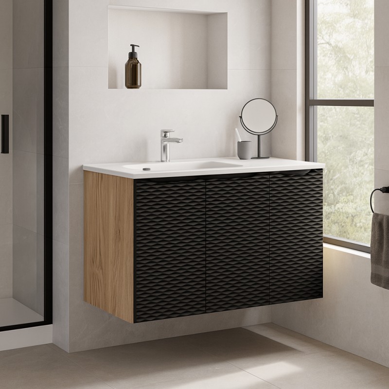 Offrez à votre salle de bain un design contemporain avec cet ensemble YOKA 90 cm noir, composé de deux meubles sous vasque à placards (60 cm + 30 cm) et d’une vasque blanche à encastrer. L’association du noir mat et du chêne clair apporte une ambiance moderne, chaleureuse et haut de gamme.