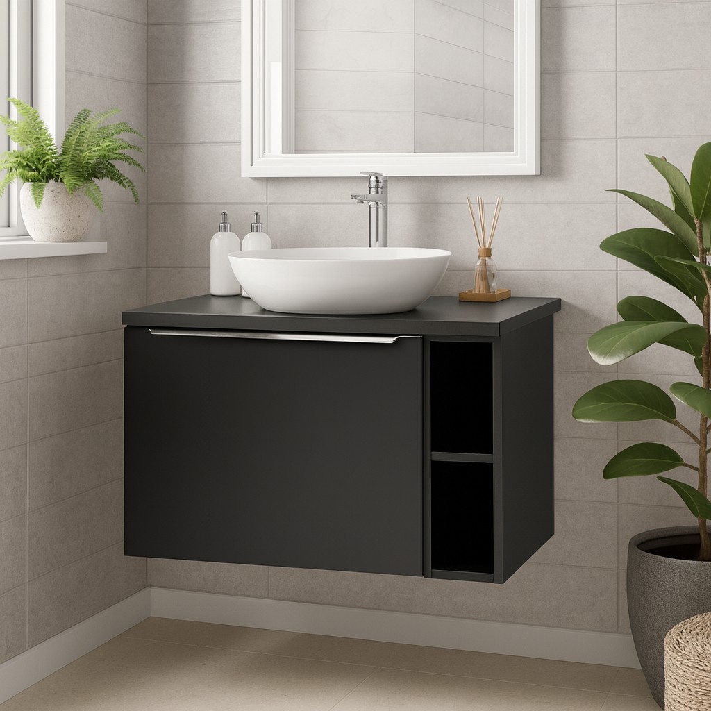 Découvrez le set de salle de bain VANTA 80 cm, un ensemble moderne et fonctionnel composé d’un meuble sous vasque suspendu, d’un plan pour vasque 80 cm et d’une vasque à poser en céramique. Grâce à sa finition noir mat et son design épuré, cet ensemble apporte une touche élégante et contemporaine à votre salle de bain.