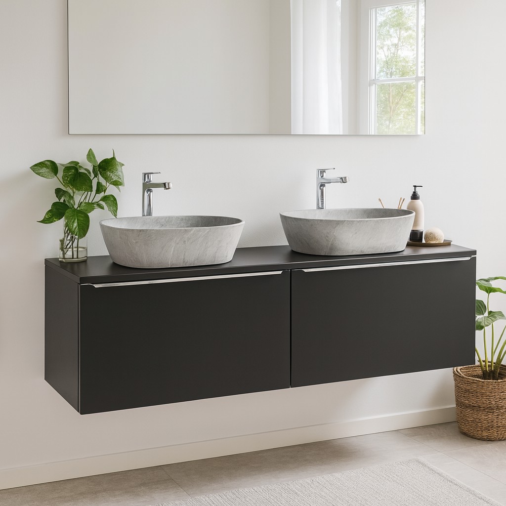 Les meubles suspendus assurent un encombrement visuel réduit et facilitent l’entretien du sol. Les vasques grises rectangulaires contrastent subtilement avec la finition noir mat, créant un ensemble harmonieux et premium, parfaitement adapté aux salles de bain modernes.