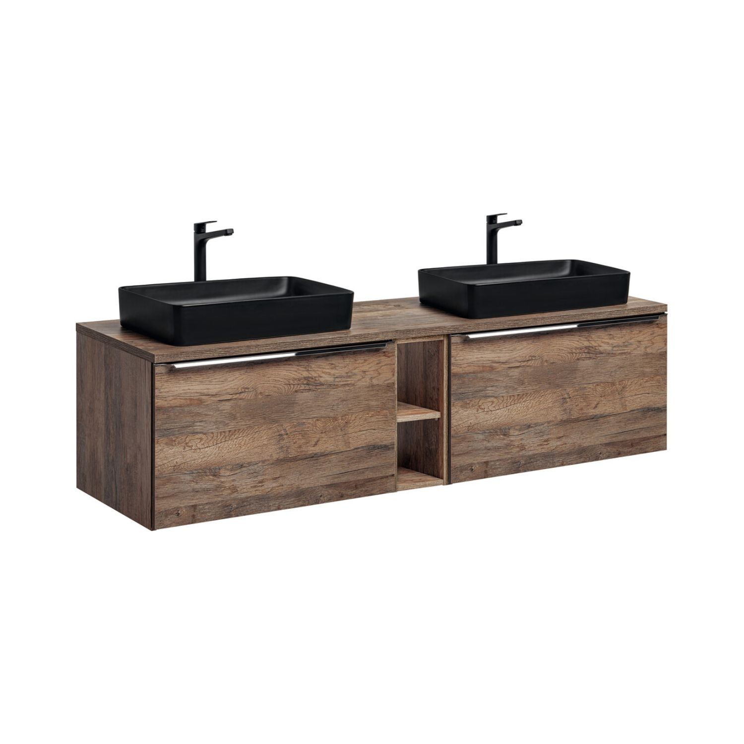 La finition chêne foncé apporte un charme naturel et chaleureux, tandis que les vasques noires créent un contraste moderne et premium. La structure en MDF et panneaux de particules de haute qualité garantit une excellente durabilité, même en environnement humide.