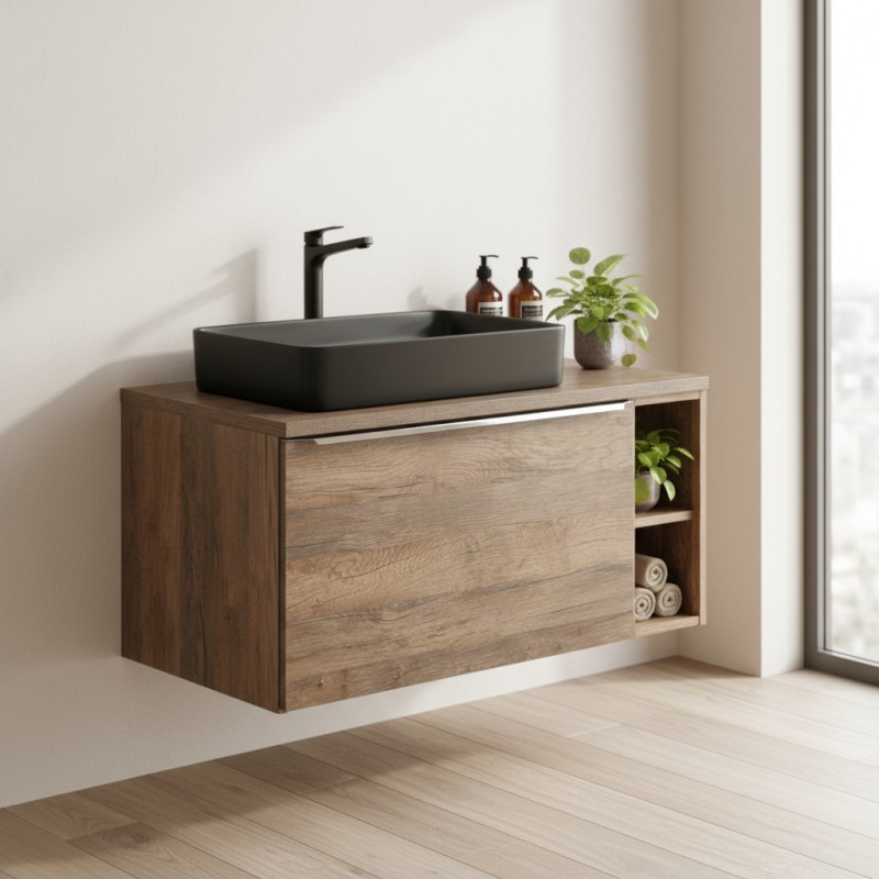 Découvrez cet ensemble VANTA 100 cm aspect bois foncé, idéal pour les salles de bain qui recherchent à la fois style, praticité et gain de place. Sa composition inclut un meuble sous vasque 80 cm, un meuble de rangement 20 cm, un plan pour vasque 100 cm et une vasque noire en céramique au design moderne.