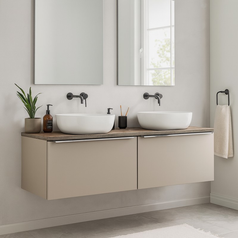 La finition taupe mate et la structure en MDF et panneaux de particules de haute qualité assurent durabilité, résistance à l’humidité et élégance. Le format suspendu permet un entretien facilité et un rendu visuel plus épuré.
