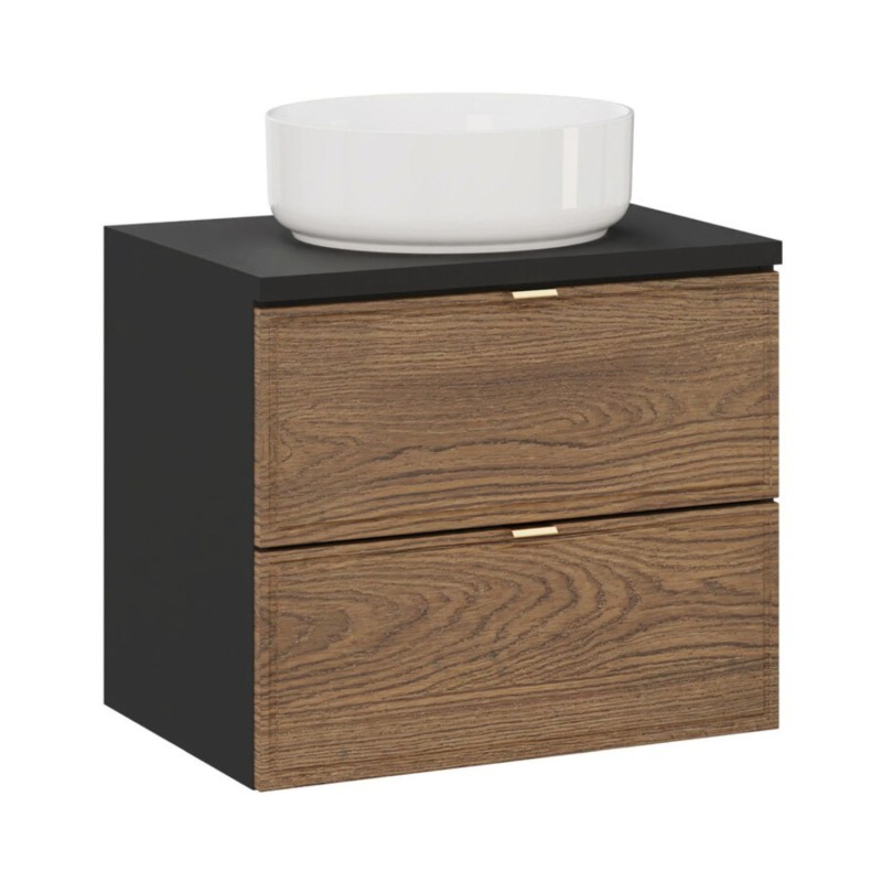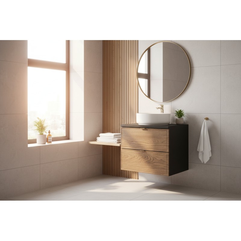 Optez pour un style moderne et compact avec cet ensemble SAVIA 60 cm. Il inclut un meuble sous vasque suspendu, un plan pour vasque assorti et une vasque blanche ronde à poser en céramique. Le contraste bois foncé et noir apporte chaleur et design à votre salle de bain.