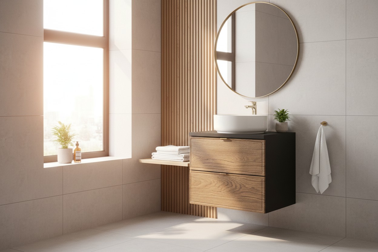 La structure en MDF et panneaux de particules assure robustesse et résistance à l’humidité. La vasque ronde, élégante et tendance, s’adapte parfaitement au format 60 cm pour un rendu harmonieux et fonctionnel.
