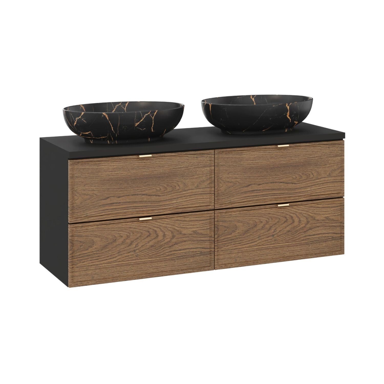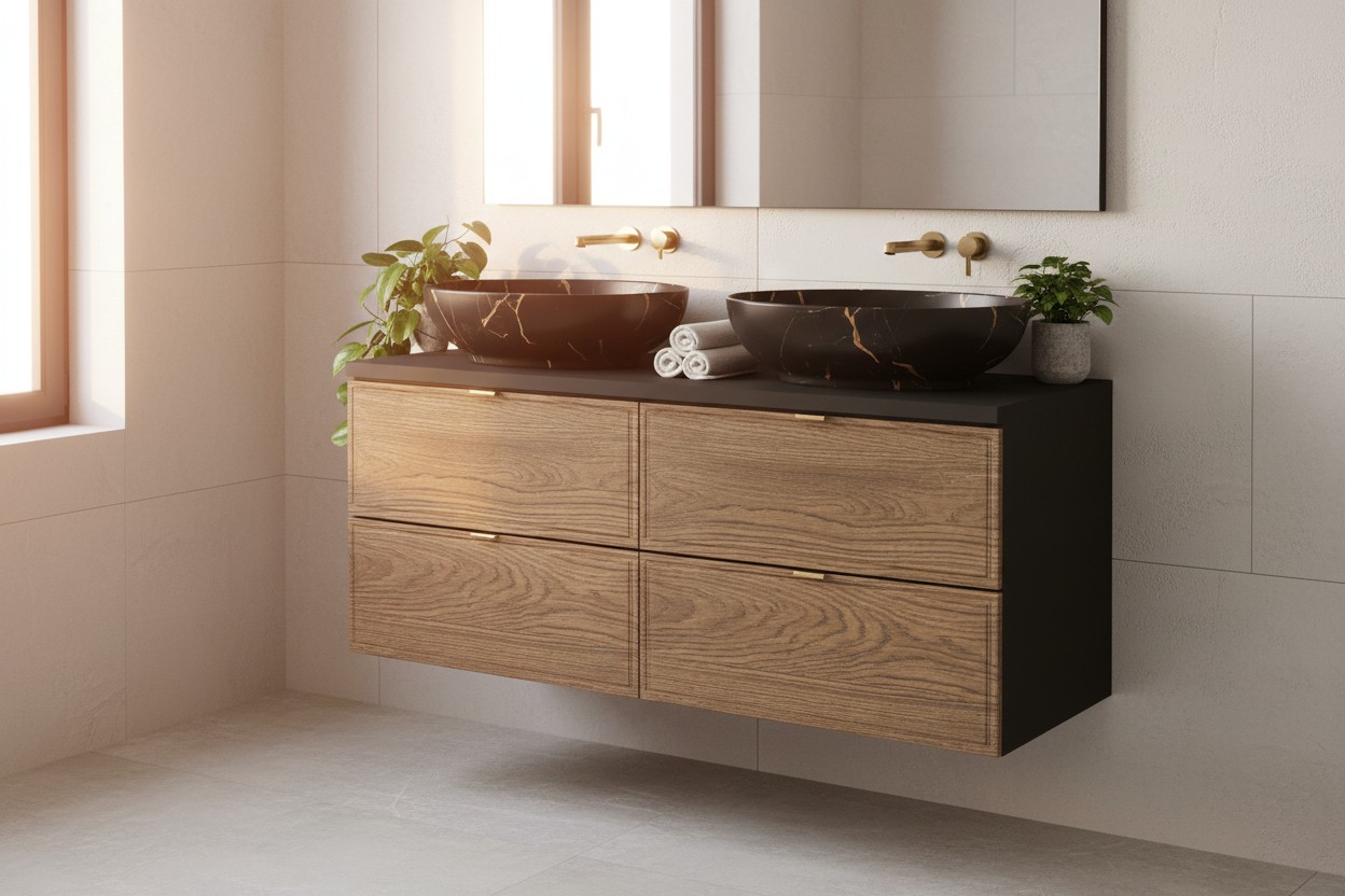 Le design bois foncé associé aux vasques noires marbrées crée un contraste saisissant. L’ensemble suspendu facilite l’entretien du sol tout en offrant un look contemporain. Les matériaux robustes garantissent une excellente résistance à l’humidité.