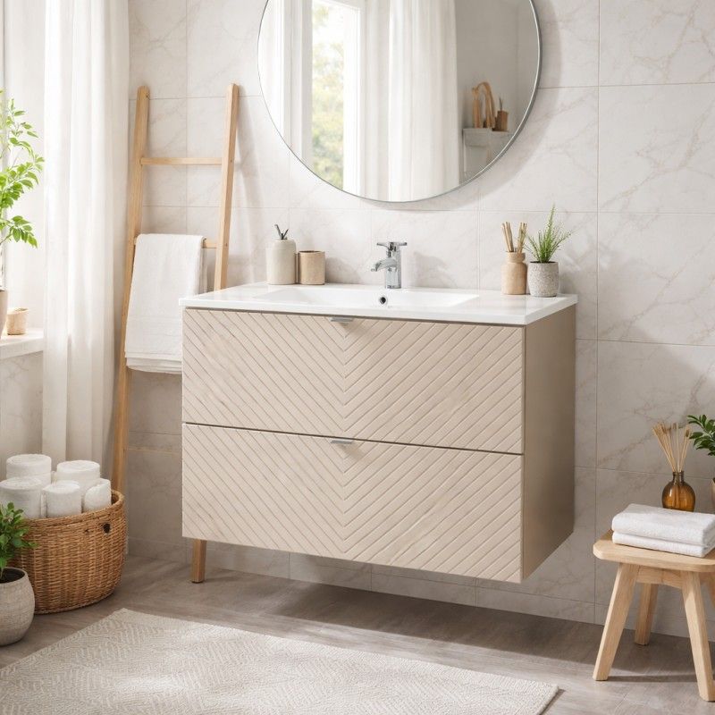 Créez une salle de bain apaisante et moderne avec cet ensemble AOKI 80 cm comprenant un meuble sous vasque suspendu à tiroirs et une vasque blanche à encastrer. Sa finition beige mat associée au blanc épuré sublime une ambiance japandi élégante et minimaliste.
