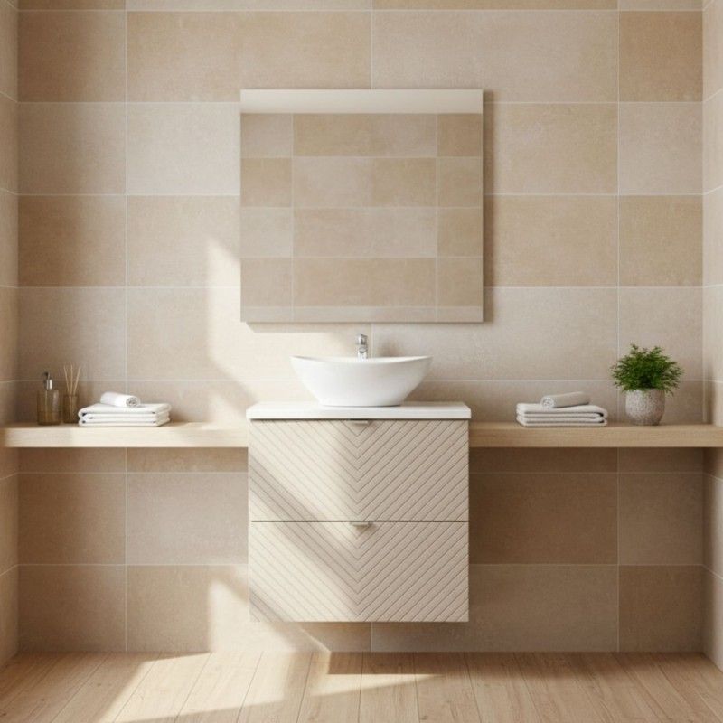 Le coloris beige cachemire mat se marie parfaitement avec le blanc lumineux de la vasque, créant un ensemble équilibré et contemporain. Sa structure suspendue facilite le nettoyage du sol et donne une sensation d’espace plus ouverte. Les matériaux en MDF et panneaux de particules de haute qualité assurent une excellente robustesse et une durabilité idéale dans les pièces humides.