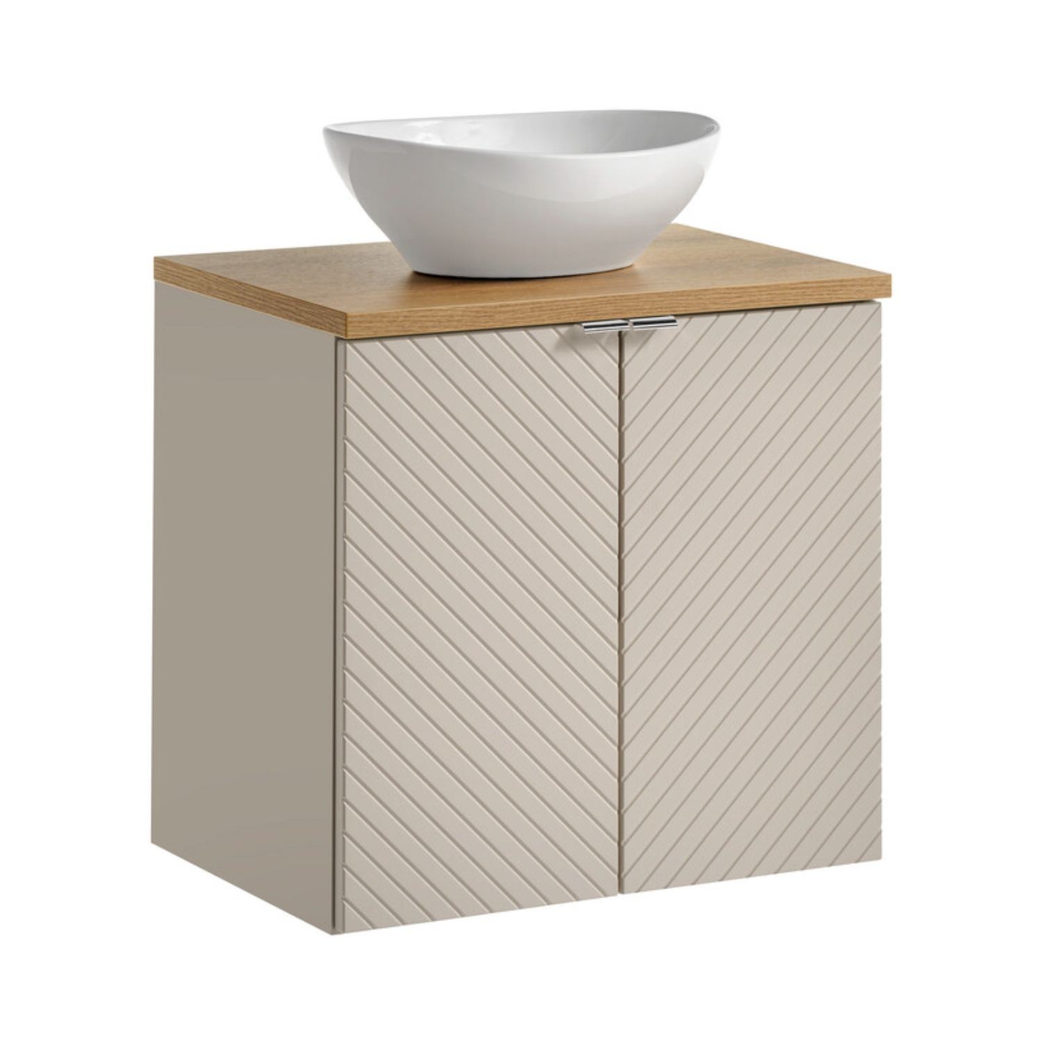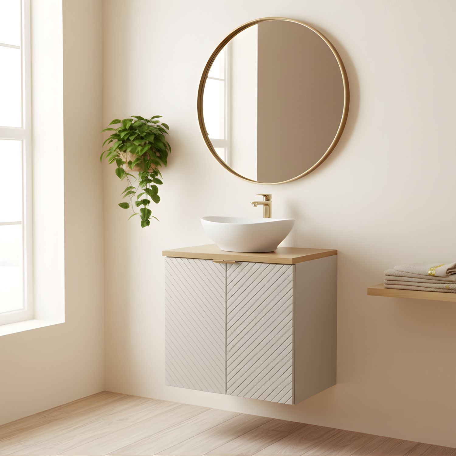 Apportez une ambiance japandi douce et naturelle à votre salle de bain avec cet ensemble AOKI 60 cm. Il combine un meuble sous vasque à portes, un plan vasque aspect bois et une vasque ronde blanche à poser. L’association du cachemire mat et du bois clair crée un ensemble harmonieux, moderne et apaisant.