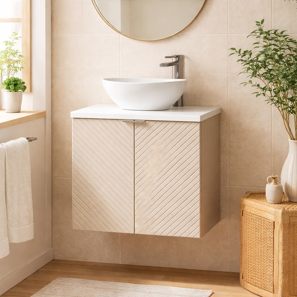 Le fini cachemire/beige mat s’accorde parfaitement avec le blanc éclatant de la vasque, créant un ensemble élégant et apaisant. Conçu en MDF et panneaux de particules de première qualité, cet ensemble assure durabilité, stabilité et résistance à l’humidité. La structure suspendue libère le sol et facilite l’entretien.