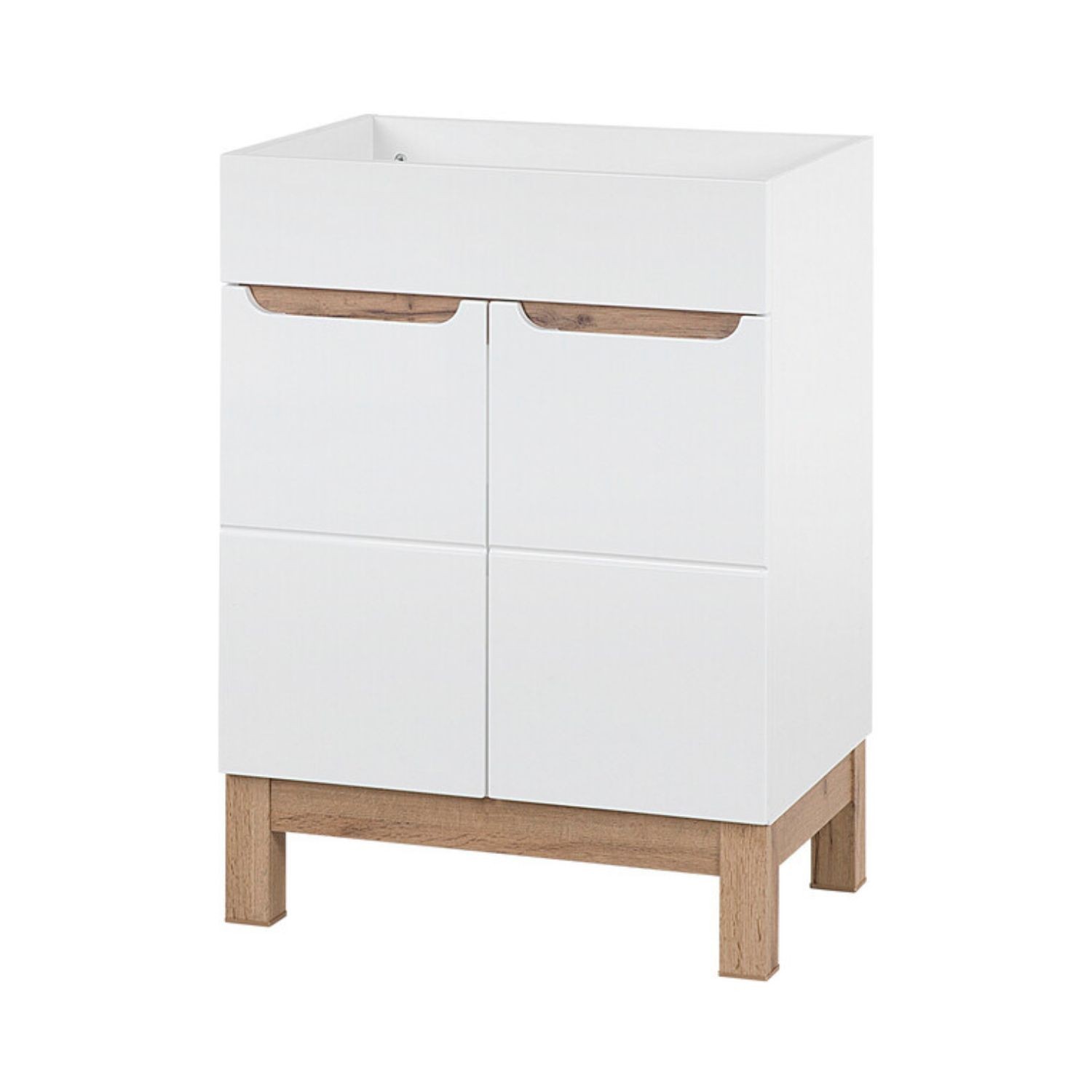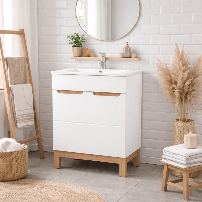 Son association du blanc brillant et du chêne clair crée une ambiance lumineuse et intemporelle. Sa conception robuste assure une bonne résistance à l’humidité tout en facilitant l’entretien au quotidien.
