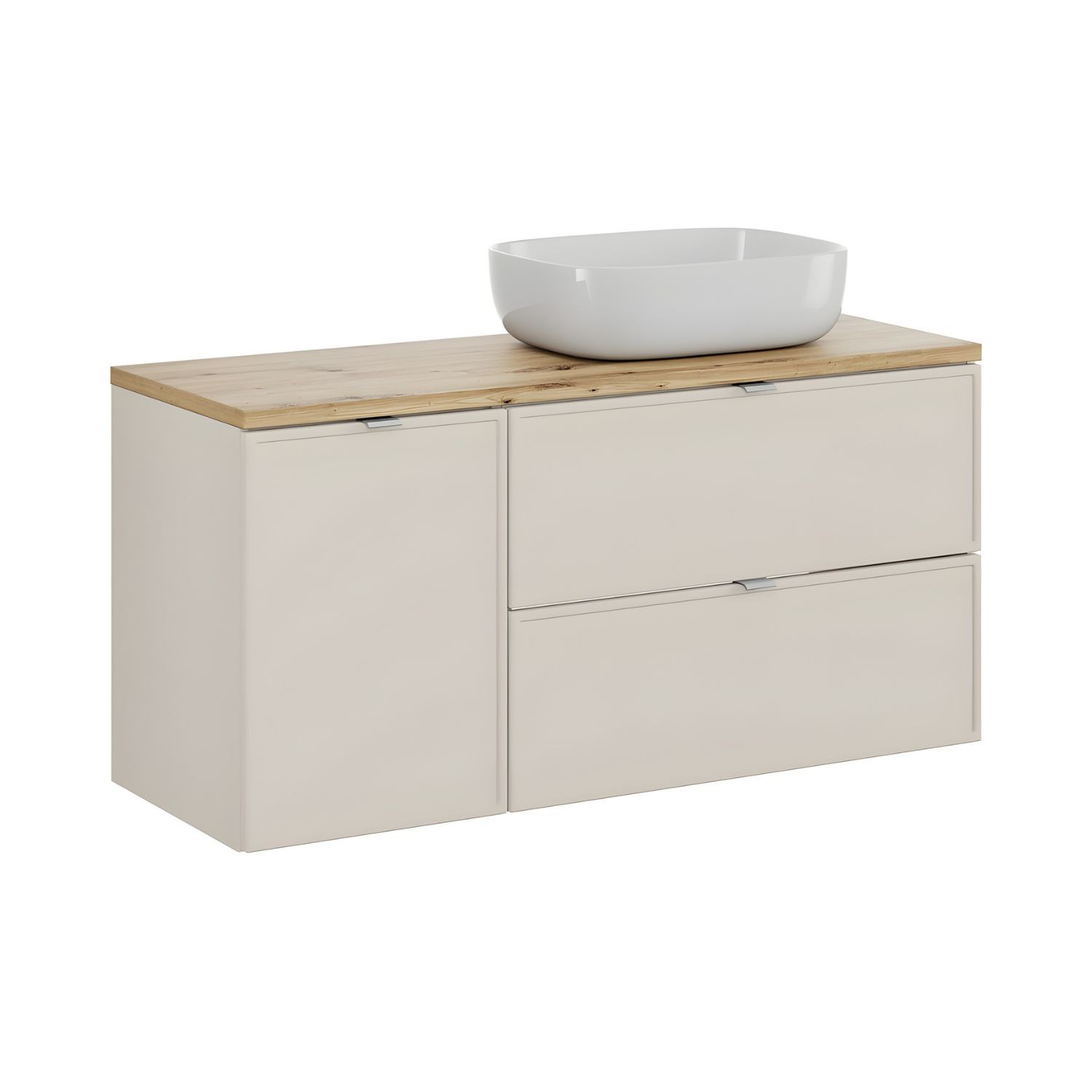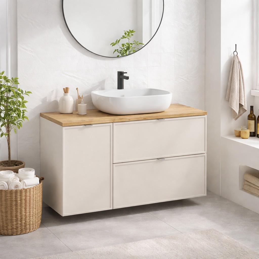 Grâce à son panier à linge intégré, cet ensemble facilite l’organisation du quotidien tout en conservant une esthétique soignée. Le plan large de 120 cm apporte un confort d’utilisation appréciable, tandis que la vasque à poser rectangulaire arrondie crée un point focal moderne et élégant. Sa finition cachemire mat renforce l’atmosphère douce et chaleureuse de la pièce, idéale pour une salle de bain contemporaine, pratique et agréable à vivre.