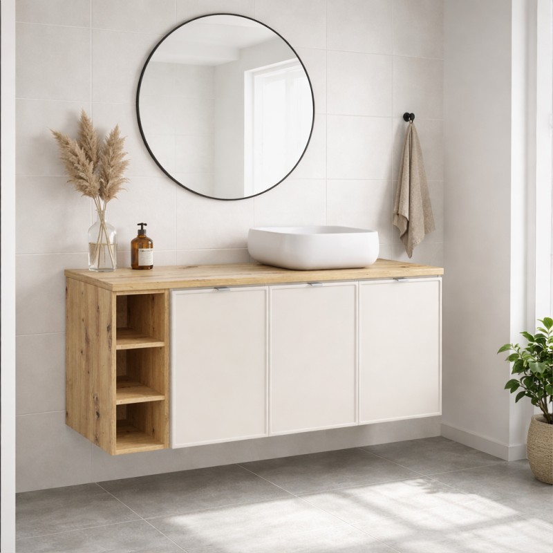 Le meuble principal en coloris cachemire offre un volume de rangement pratique grâce à ses portes battantes, tandis que les niches visibles en aspect bois apportent une touche décorative chaleureuse et fonctionnelle. Le plan pour vasque assorti renforce l’harmonie visuelle de l’ensemble, et la vasque blanche à poser, aux angles subtilement arrondis, adoucit les lignes pour un rendu moderne et équilibré. Ce format 140 cm est idéal pour une salle de bain confortable, organisée et esthétiquement soignée.