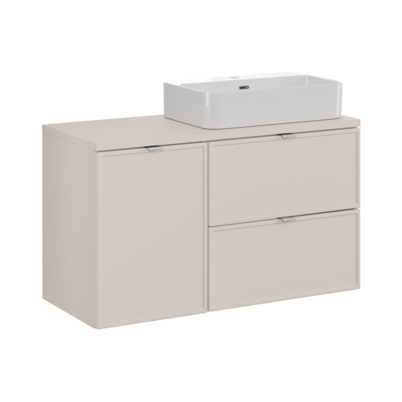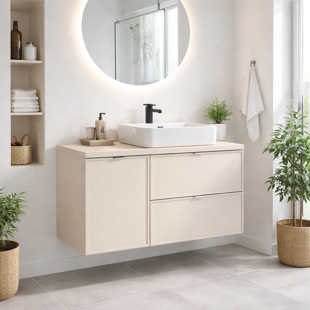 La combinaison du meuble principal et du panier à linge permet d’optimiser le rangement tout en dissimulant discrètement le linge sale. Les tiroirs coulissants assurent un accès fluide à vos produits du quotidien, tandis que le plan pour vasque structure l’ensemble avec sobriété. La vasque blanche en céramique apporte une touche lumineuse et moderne qui contraste harmonieusement avec le cachemire mat des meubles. Cette configuration est idéale pour une salle de bain fonctionnelle, équilibrée et pensée pour un usage quotidien confortable.