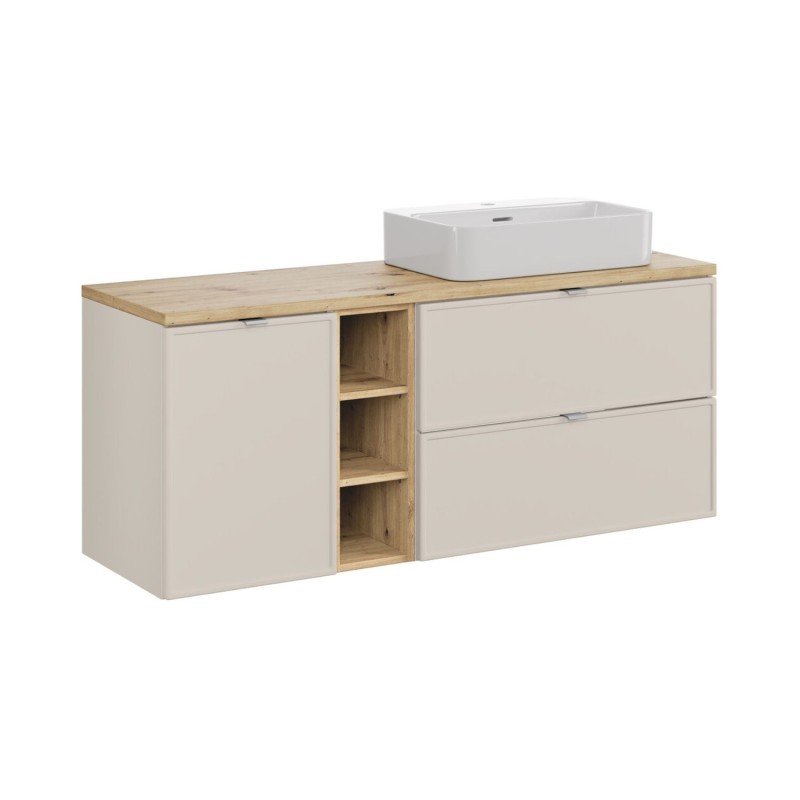 Composé d’un meuble sous vasque à tiroirs, d’un module avec 3 niches visibles, d’un meuble avec panier à linge intégré, d’un plan pour vasque finition aspect bois et d’une vasque rectangulaire à poser blanche, cet ensemble a été pensé pour optimiser chaque centimètre. Les tiroirs coulissants offrent un rangement pratique au quotidien, les niches ouvertes structurent visuellement l’ensemble tout en permettant d’exposer vos accessoires, et le panier à linge intégré garantit un espace toujours ordonné. La vasque à poser en céramique blanche apporte la touche finale lumineuse et élégante.