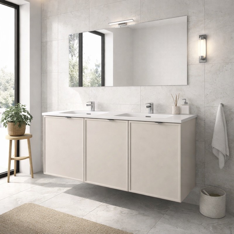 Son format 120 cm permet une organisation optimale tout en conservant une esthétique contemporaine. Les portes battantes offrent un accès pratique aux rangements, parfaits pour vos produits et accessoires. La double vasque encastrée apporte une ligne épurée et moderne, tout en facilitant l’entretien grâce à sa surface en céramique résistante. Son coloris cachemire mat crée une ambiance douce et élégante, adaptée aux salles de bain actuelles.