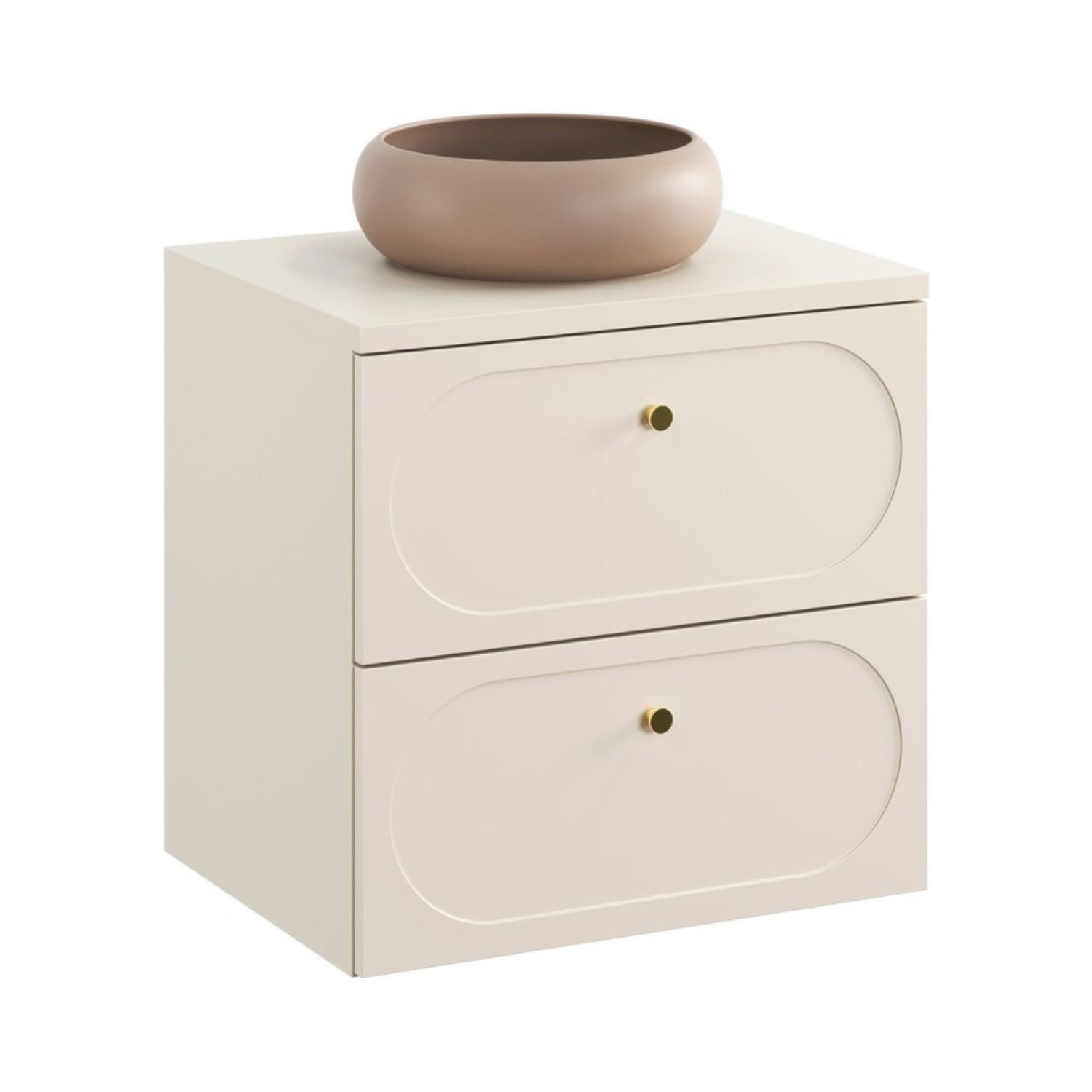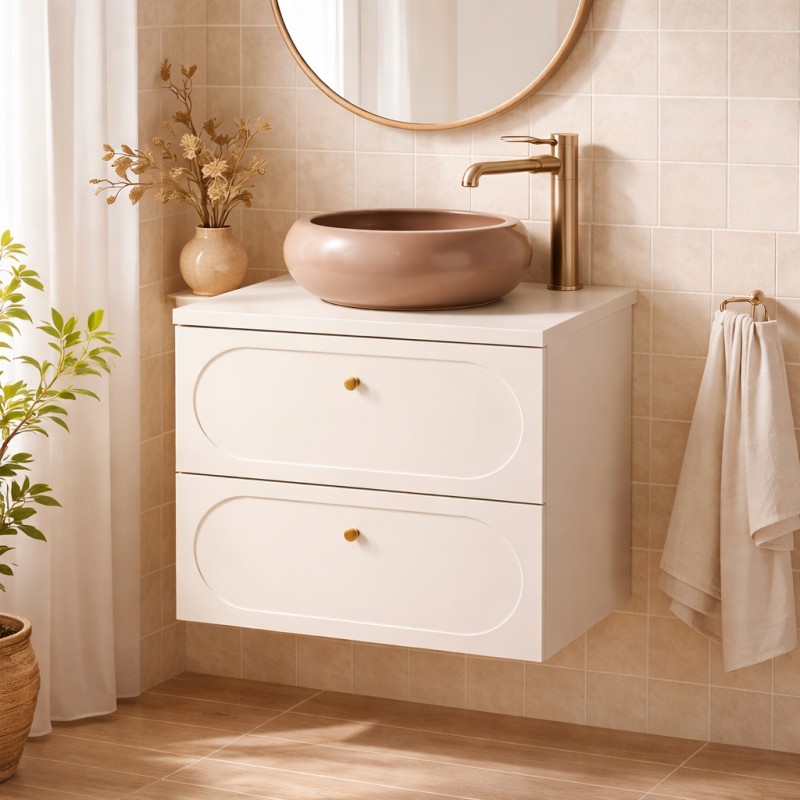 Le meuble sous vasque se distingue par ses poignées aux finitions dorées et ses façades décorées d’un encadrement ovale légèrement creusé, signature élégante de la collection. Ses deux tiroirs coulissants assurent un rangement pratique au quotidien. Le plan assorti accueille la vasque ronde en céramique, créant un contraste harmonieux entre beige sable et marron profond.