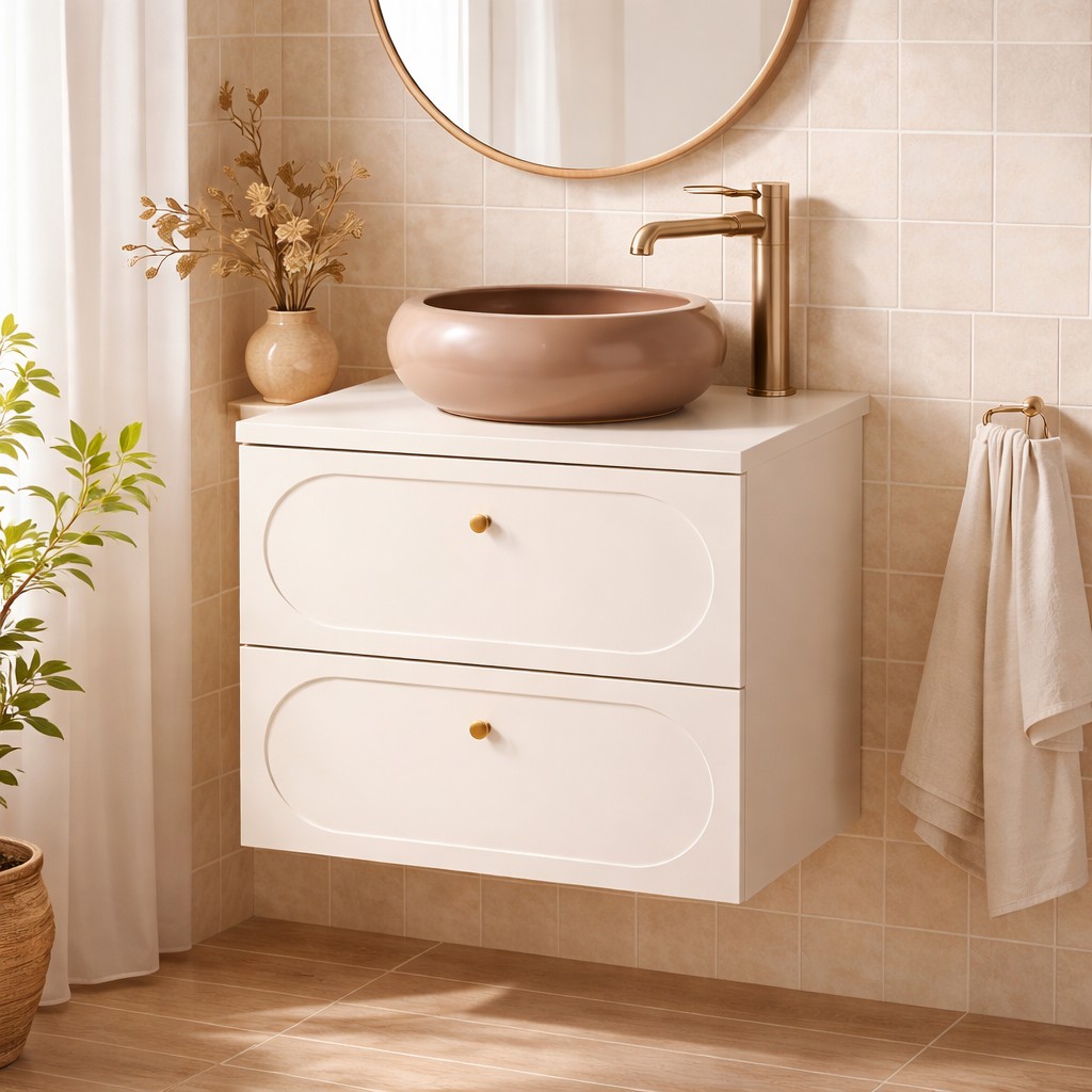 Alliant élégance et proportions équilibrées, cet ensemble TORNADO 80 cm en beige sable est sublimé par une vasque à poser ronde marron cappuccino. Une composition harmonieuse qui structure visuellement l’espace bain.