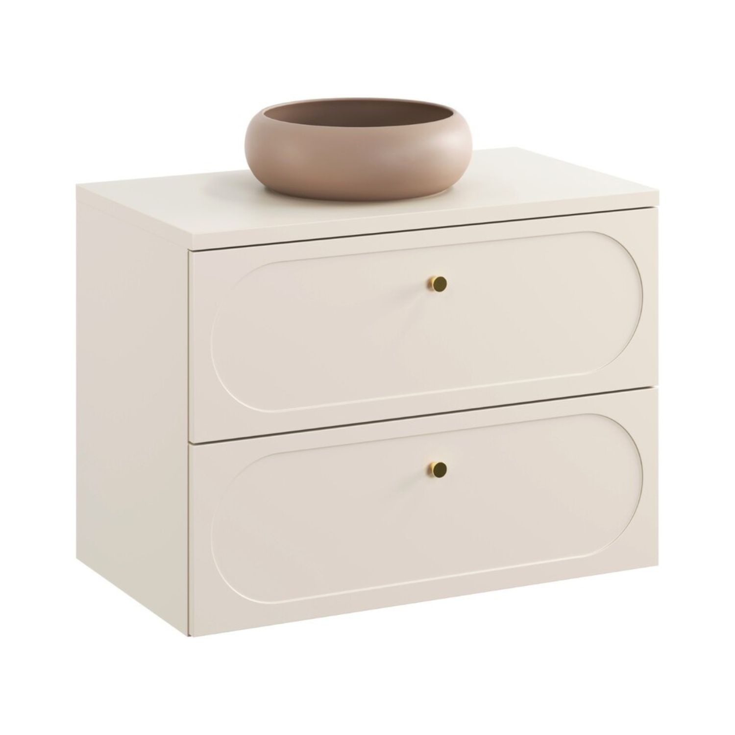 Le meuble sous vasque se distingue par ses poignées aux finitions dorées et ses façades décorées d’un encadrement ovale légèrement creusé, signature raffinée de la collection. Les deux tiroirs coulissants offrent un rangement fonctionnel et accessible. Le plan assorti met en valeur la vasque ronde en céramique, créant un contraste chaleureux et contemporain.