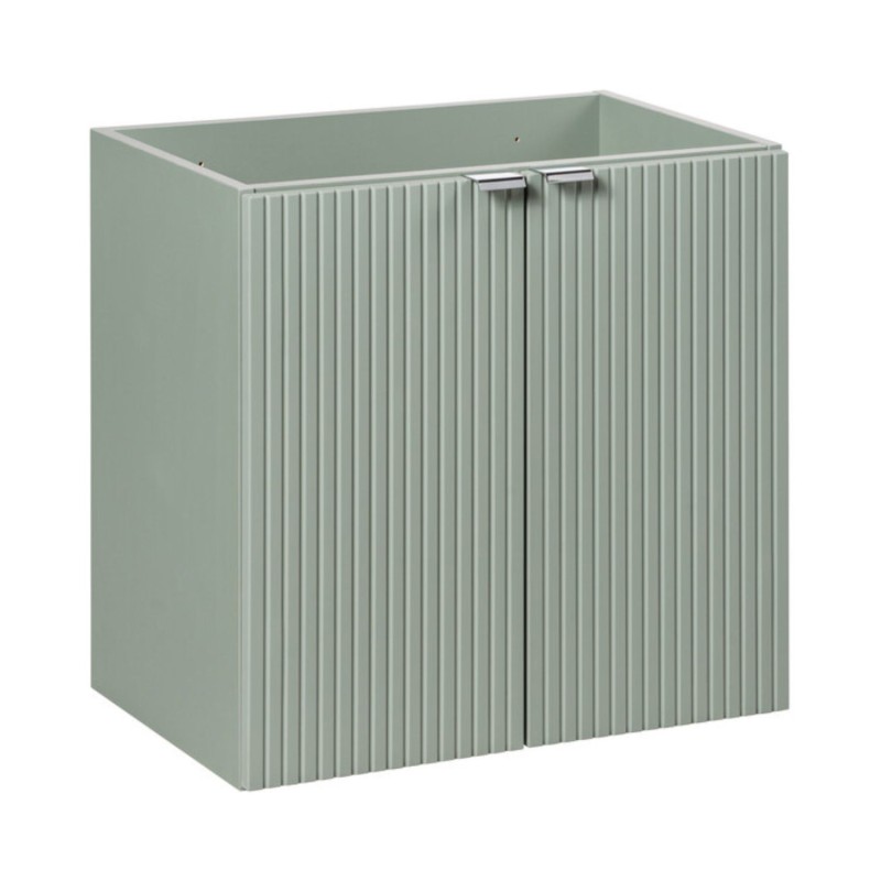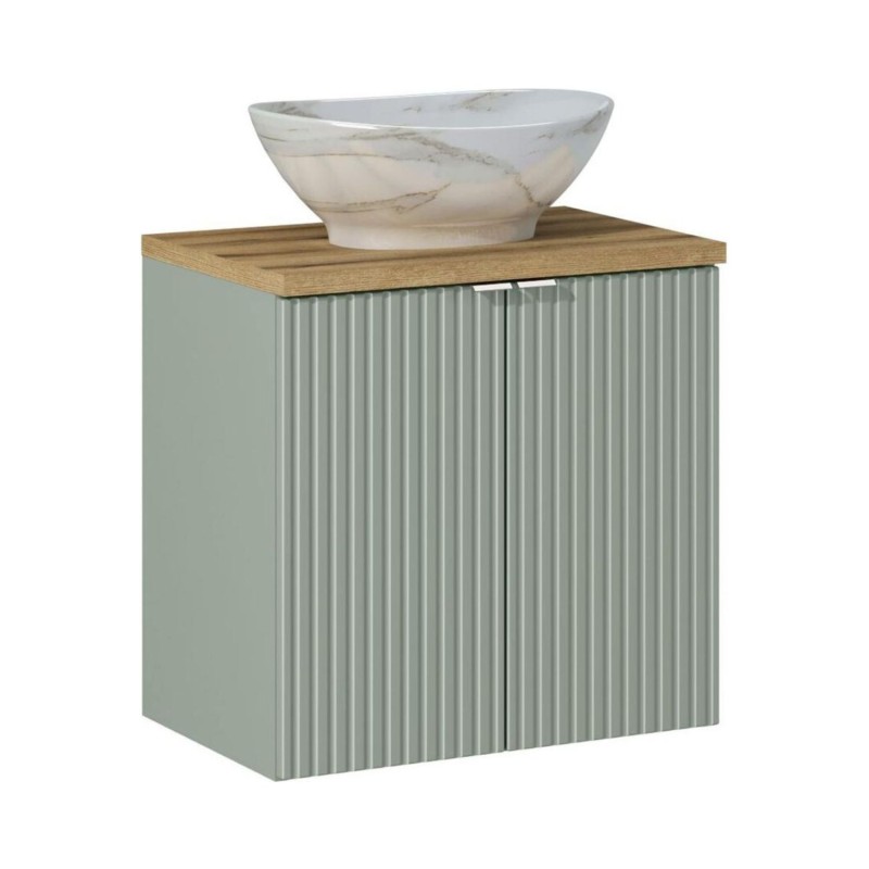Le meuble se distingue par ses façades rainurées verticalement, qui apportent du relief et soulignent l’identité esthétique de la collection ELVINA. Le coloris vert sauge gris, doux et élégant, s’accorde parfaitement avec le plan bois foncé, créant un contraste chaleureux et moderne.