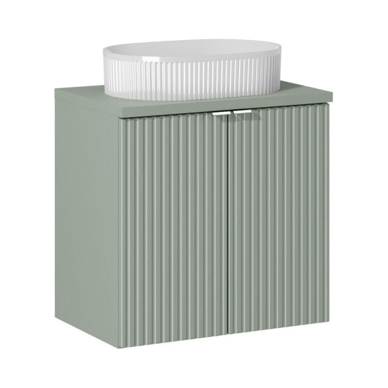 L’ensemble de salle de bain ELVINA 60 cm apporte une touche contemporaine et raffinée à votre intérieur. Cette composition suspendue associe un meuble sous vasque vert sauge gris à placards, un plan pour vasque assorti et une vasque à poser rainurée blanche, créant un ensemble harmonieux et moderne.