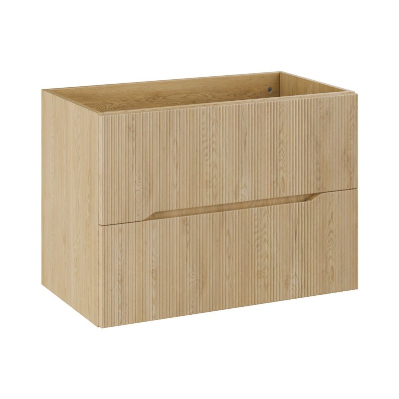 Le meuble présente des façades rainurées verticalement, caractéristique emblématique de la collection NATURA. Le coloris marron bois aspect chêne clair crée une ambiance chaleureuse et naturelle, tandis que la vasque asymétrique en céramique blanche marbrée apporte une note design et raffinée.