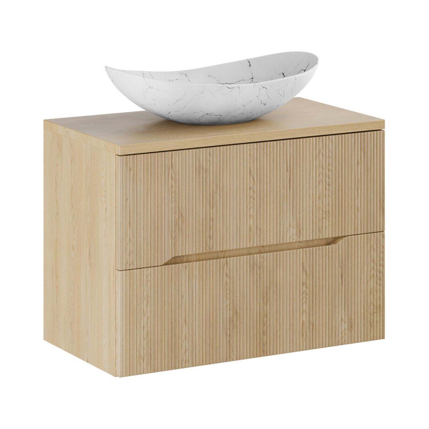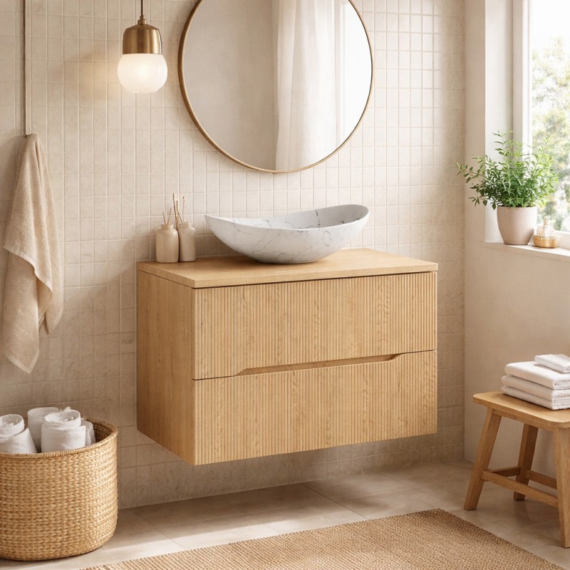 L’ensemble de salle de bain suspendu NATURA 80 cm associe design naturel et touche contemporaine pour créer un espace de toilette élégant. Cette composition comprend un meuble sous vasque de 80 cm en aspect chêne clair, un plan pour vasque et une vasque à poser asymétrique blanche marbrée qui apporte une signature esthétique originale à votre salle de bain.