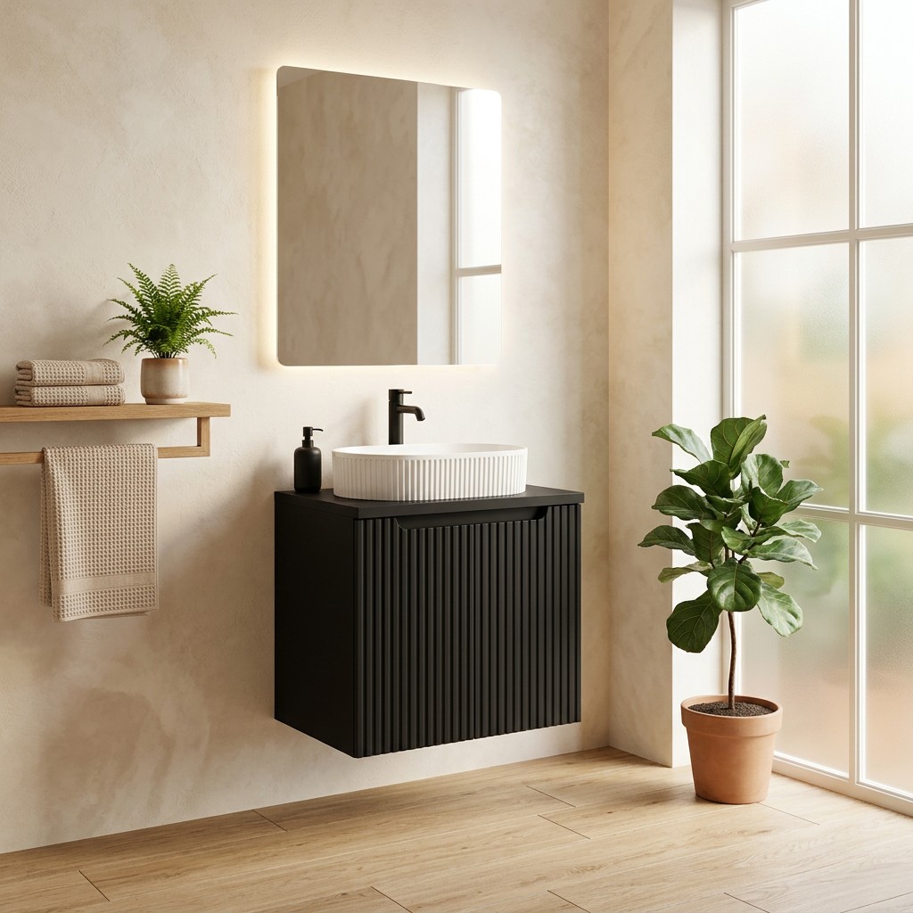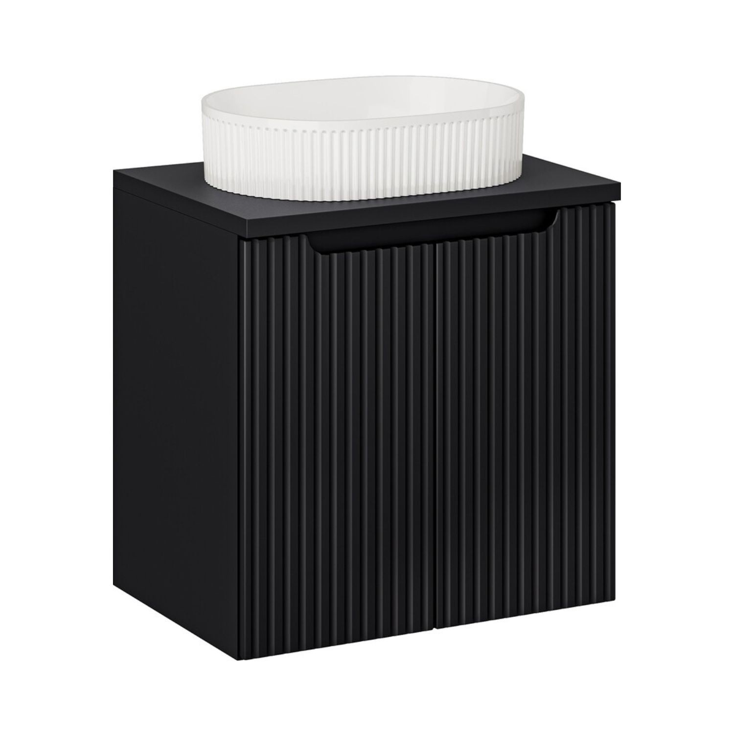 La façade du meuble présente un motif rainuré verticalement qui apporte du relief et souligne le style design de l’ensemble. Le coloris noir mat renforce l’esthétique moderne du meuble et s’intègre facilement dans différents styles de salles de bain.