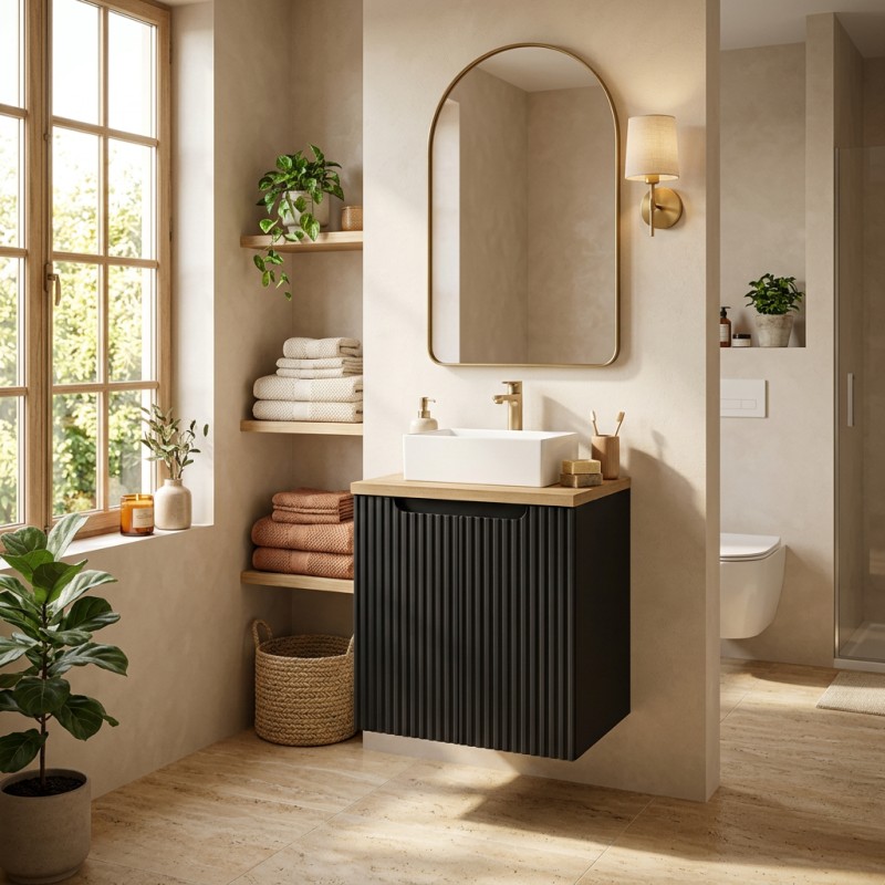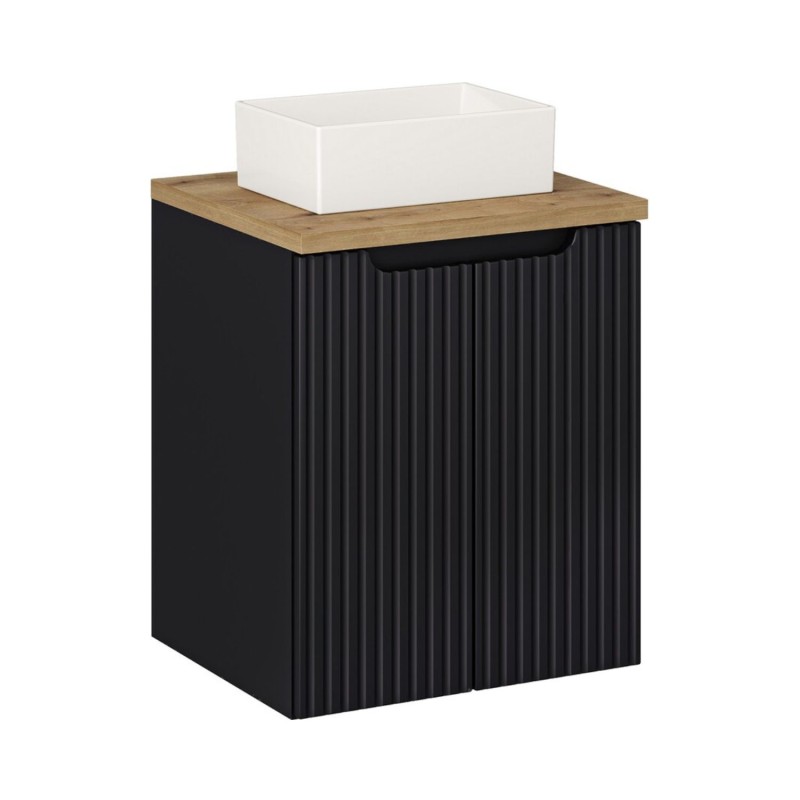 L’ensemble de salle de bain VANO 50 cm est conçu pour apporter une solution moderne et fonctionnelle aux petites salles de bain. Cette composition comprend un meuble sous vasque à placards noir mat, un plan pour vasque aspect chêne clair et une vasque à poser rectangulaire blanche en céramique.