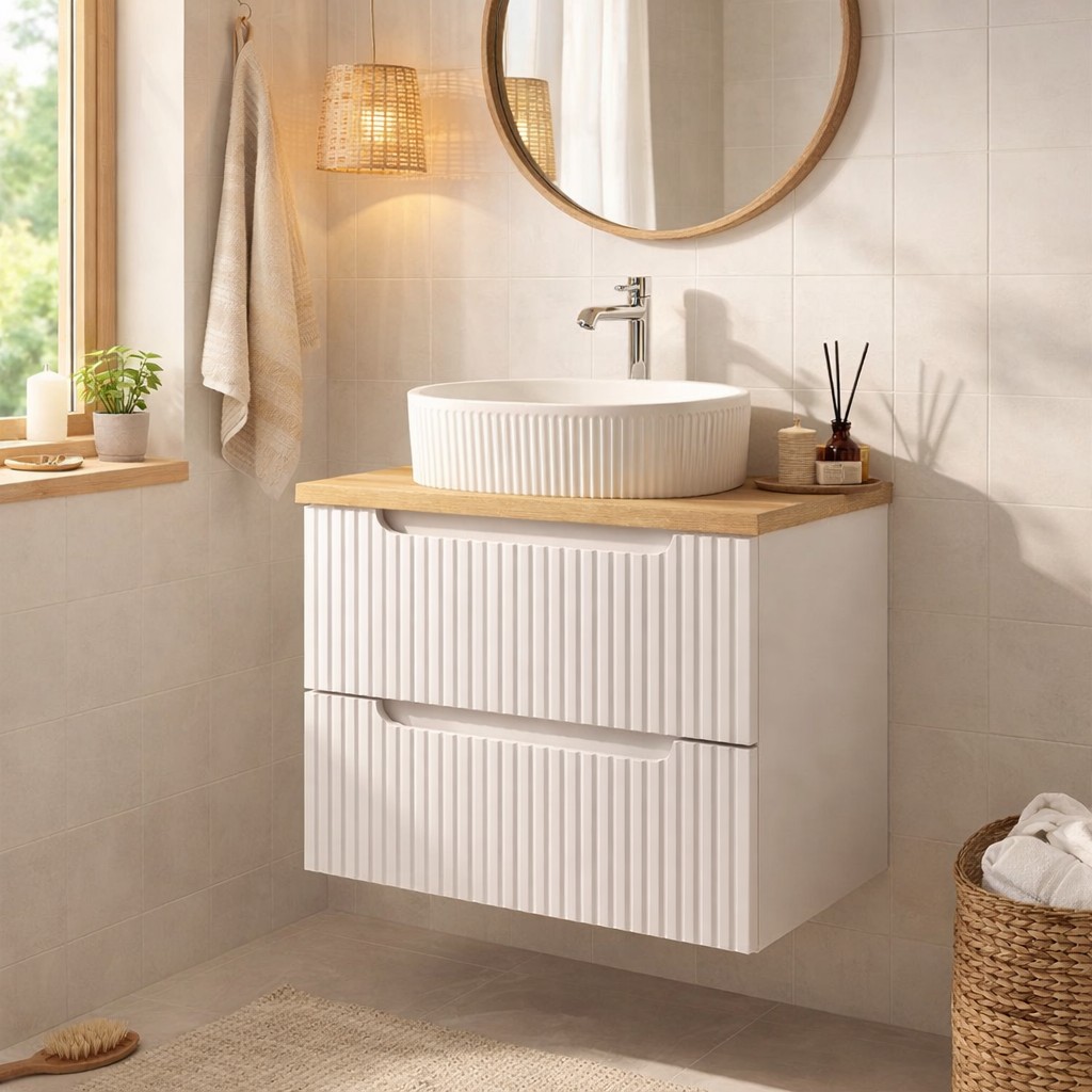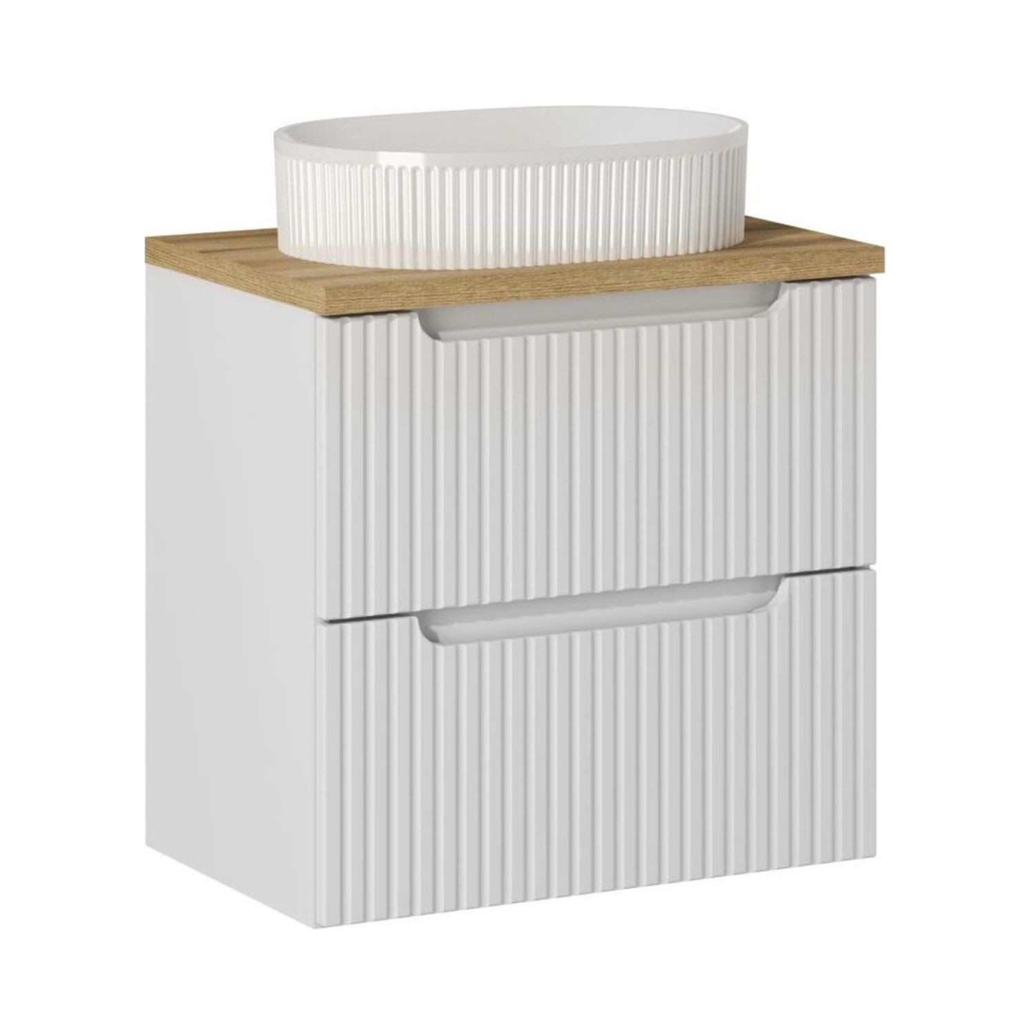 L’ensemble de salle de bain VANO 60 cm est une solution idéale pour aménager un espace compact avec élégance et fonctionnalité. Il comprend un meuble sous vasque suspendu blanc mat avec façades rainurées verticalement, un plan pour vasque aspect chêne clair ainsi qu’une vasque à poser ovale.