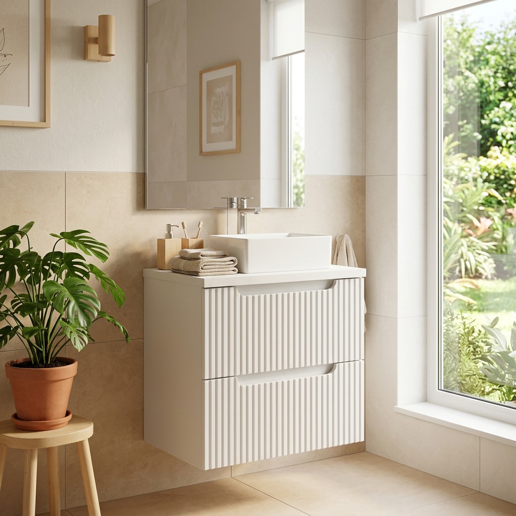 Son design entièrement blanc apporte luminosité et sobriété à votre salle de bain. Les façades rainurées offrent un rendu graphique moderne tout en conservant une esthétique épurée.