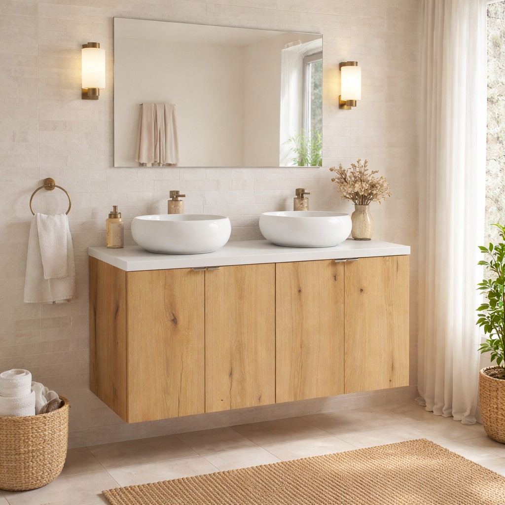 L’ensemble est complété par deux vasques à poser rondes en céramique blanche, élégantes et faciles à entretenir, qui renforcent le style moderne et épuré de la composition.