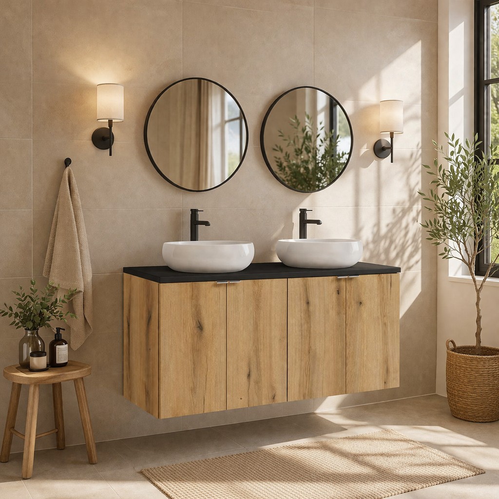 L’ensemble est complété par deux vasques à poser rondes en céramique blanche, qui apportent luminosité et finesse au design tout en assurant un confort d’utilisation optimal.