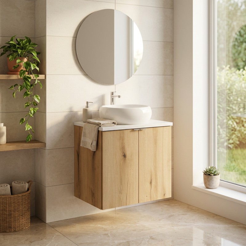 L’ensemble est complété par une vasque à poser ronde en céramique blanche, qui renforce la luminosité et garantit un usage confortable ainsi qu’un entretien simplifié.
