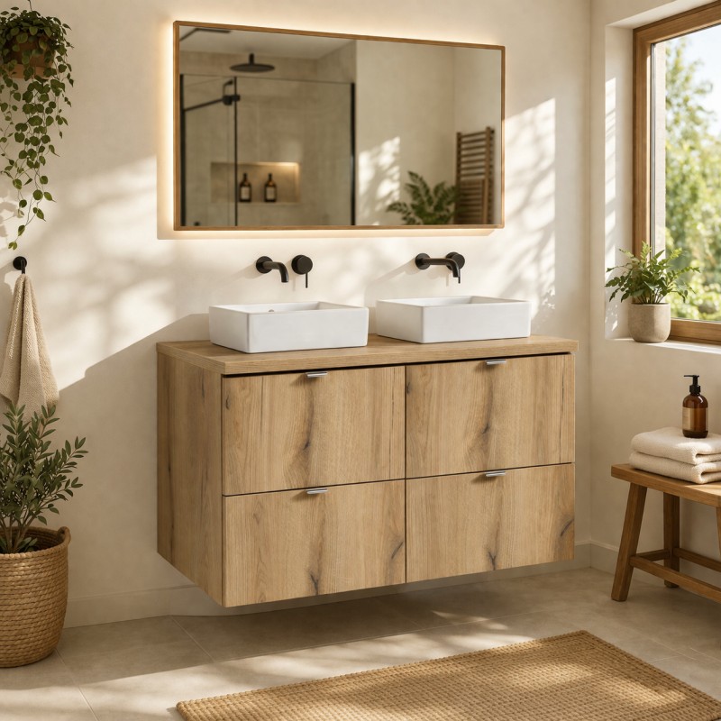 Le plan pour vasque associé aux deux vasques à poser en céramique blanche garantit un confort d’utilisation optimal, parfait pour un usage quotidien à deux.