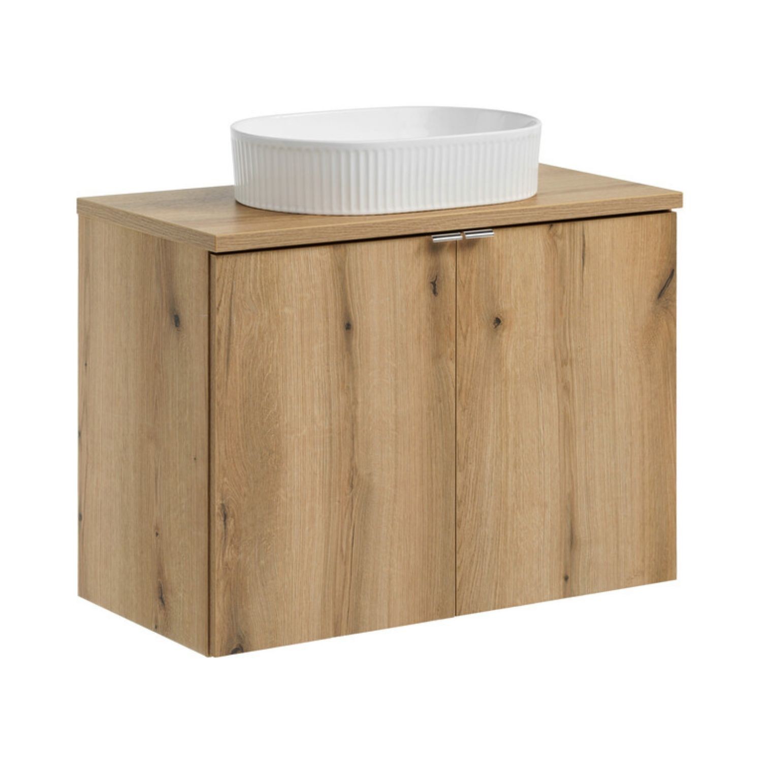 La vasque à poser en céramique blanche, avec sa forme ovale et ses rainures verticales, apporte une touche design originale et lumineuse à l’ensemble.