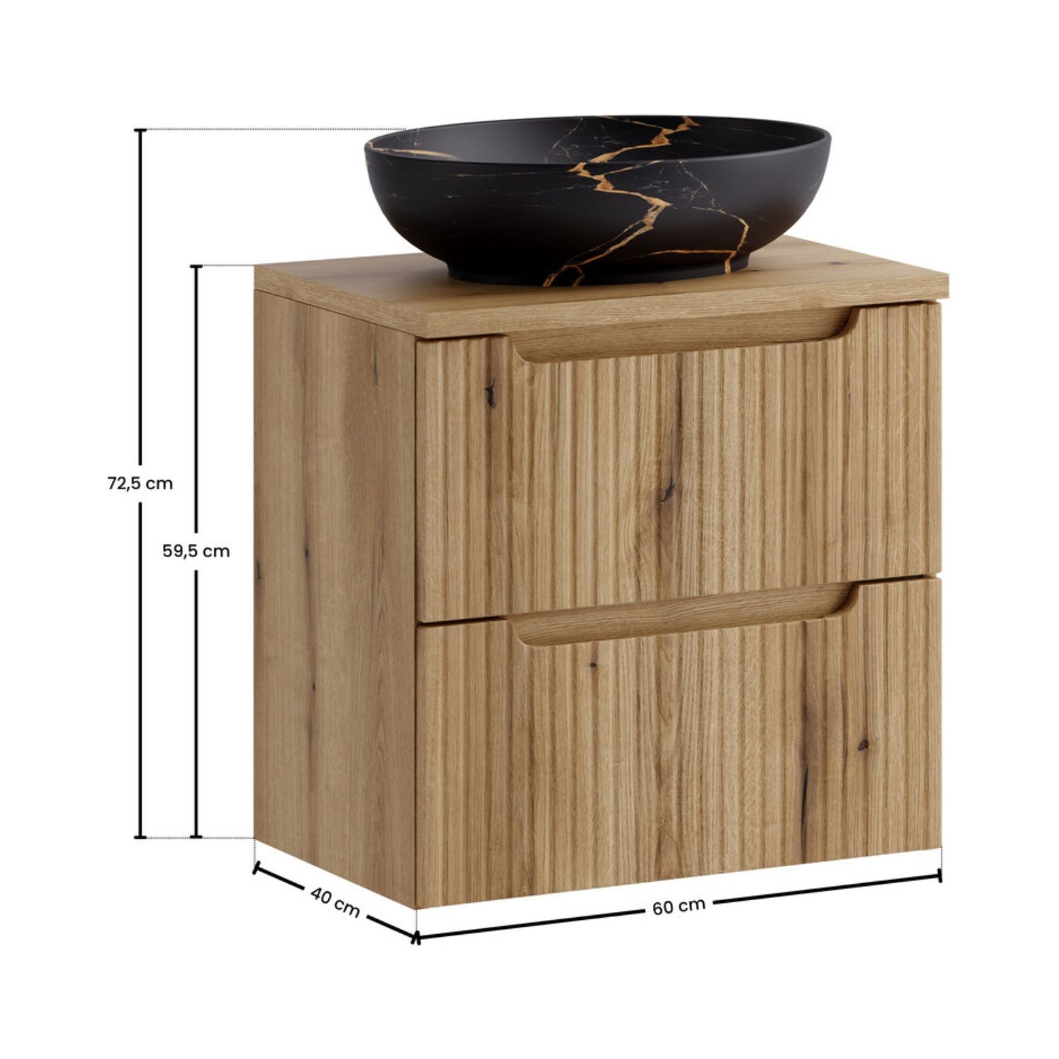 | Dimensions des éléments (en cm) | 1 meuble sous vasque 2 tiroirs : 60x57x39 + 1 plan pour vasque : 60,4x2,5x40 + 1 vasque à poser : 52x13x39,5 |