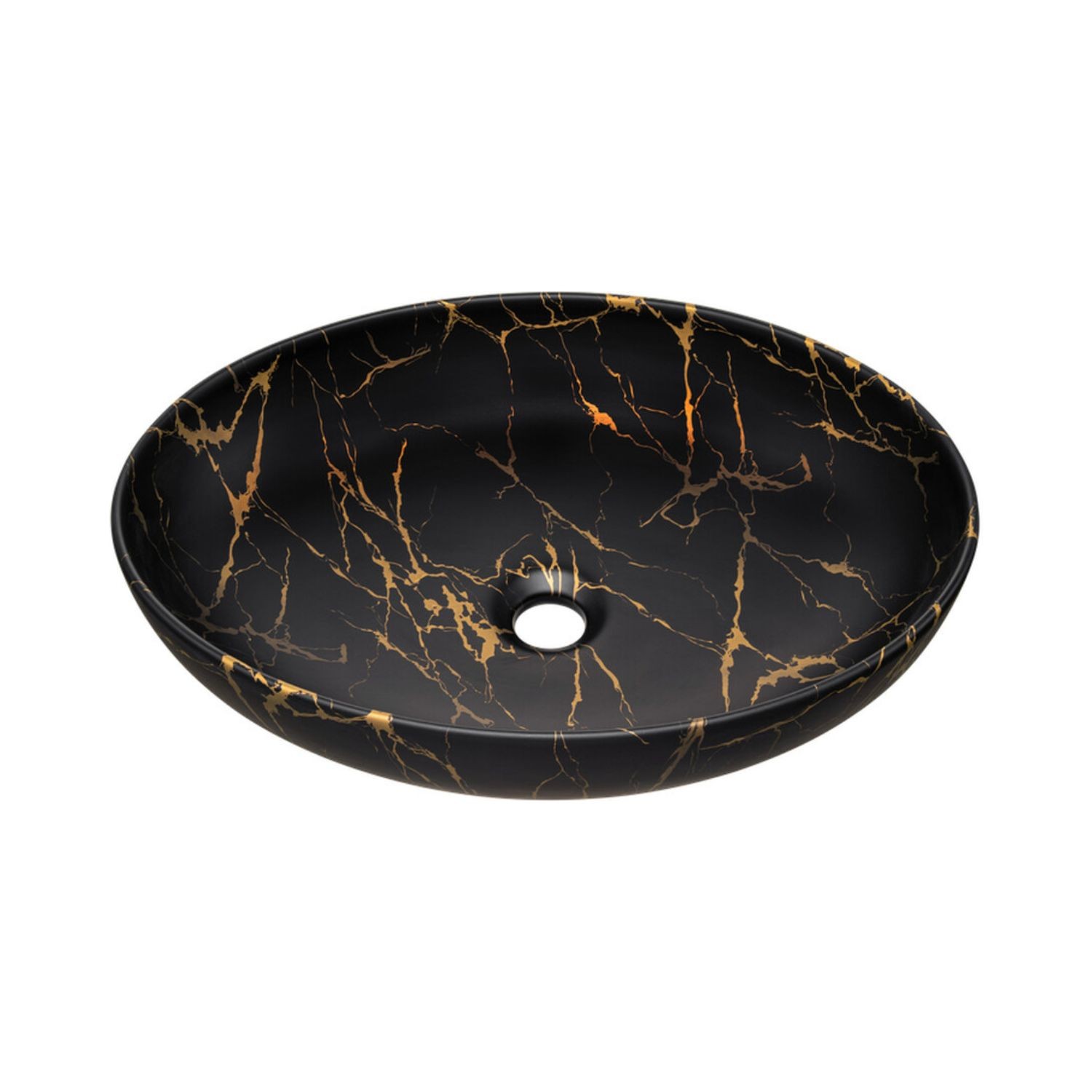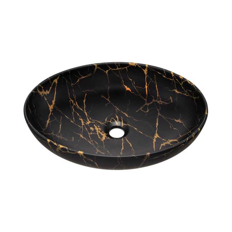 Le plan pour vasque accueille une superbe vasque à poser en céramique noire marbrée bronze, de forme ovale, qui apporte une véritable touche décorative et sophistiquée à votre salle de bain.