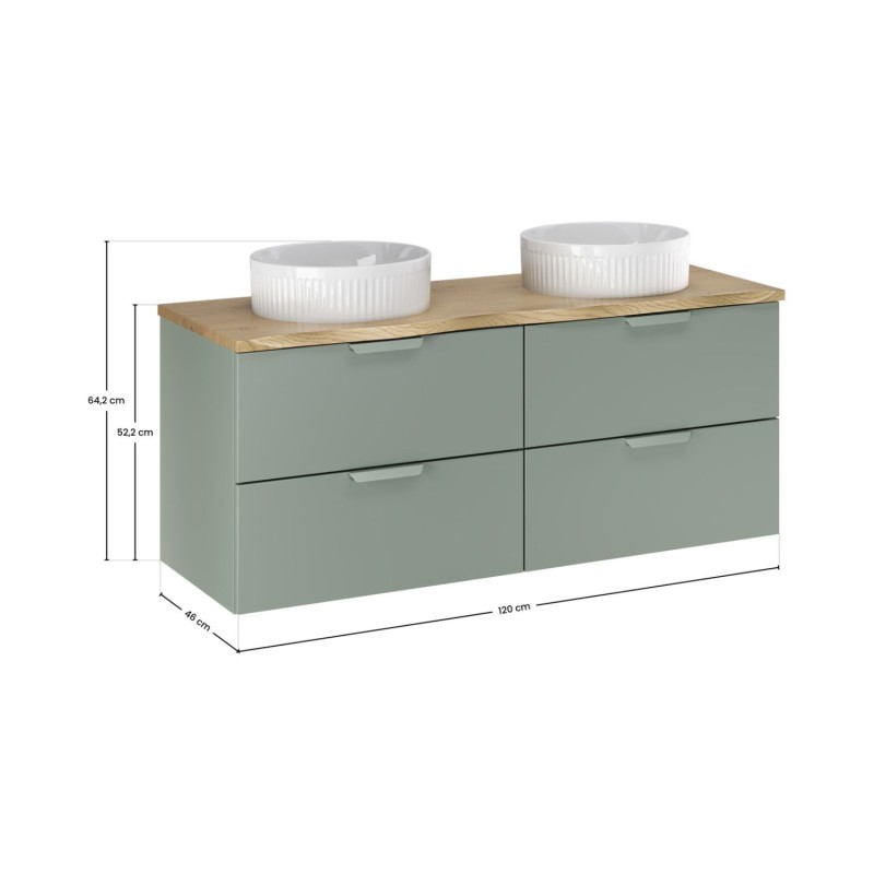 Apportez caractère et modernité à votre intérieur avec cet ensemble de salle de bain OSTER 120 cm, composé de meubles sous vasque vert sauge à tiroirs, d’un plan pour vasque aspect chêne clair et de deux vasques à poser en céramique blanche.