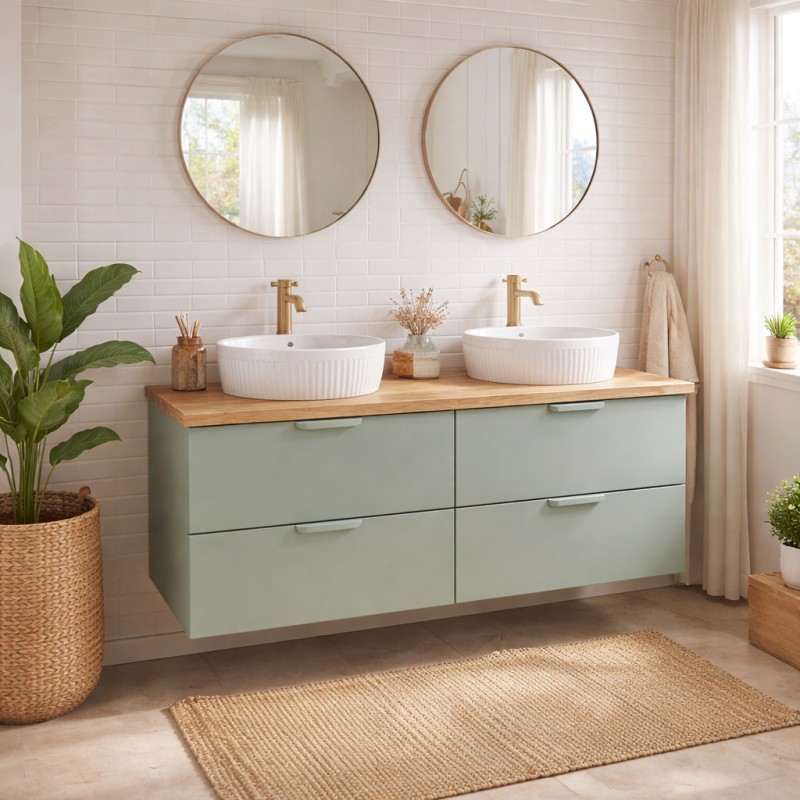 L’association du vert sauge mat et du bois clair instaure une ambiance apaisante et contemporaine, idéale pour une salle de bain moderne.