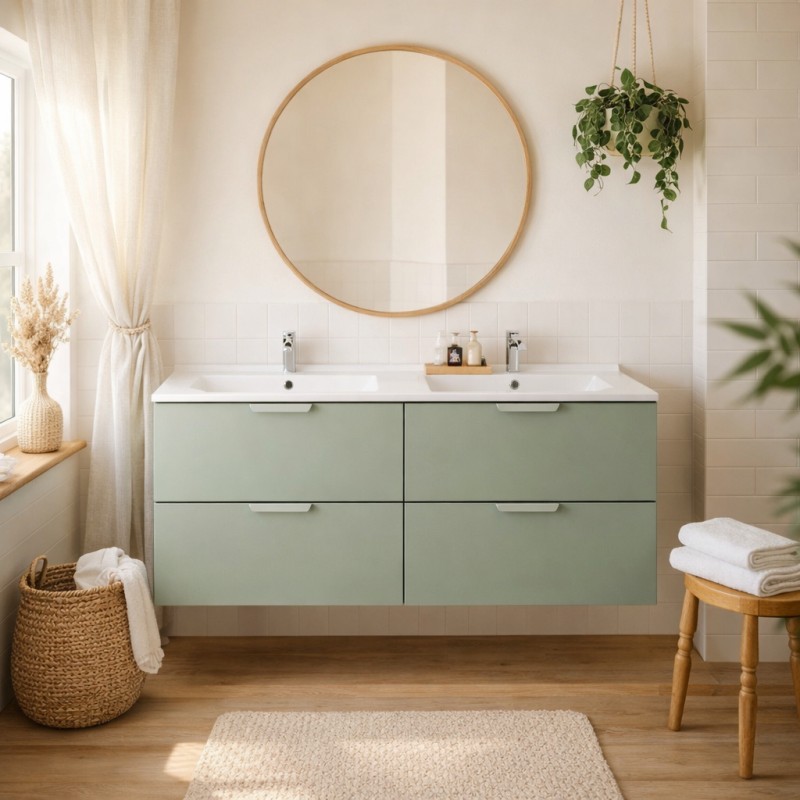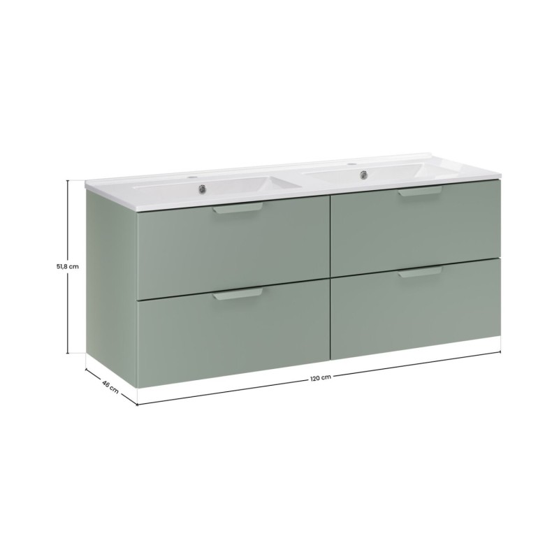 Transformez votre espace avec cet ensemble de salle de bain OSTER 120 cm, composé de deux meubles sous vasque vert sauge à tiroirs et d’une double vasque encastrée en céramique blanche pour un rendu à la fois moderne et fonctionnel.