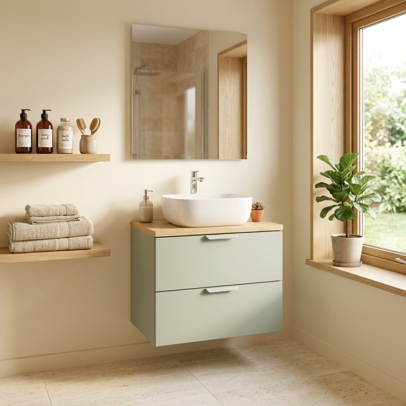 L’association du vert sauge mat et du chêne clair crée une ambiance douce et contemporaine, parfaite pour une salle de bain tendance.