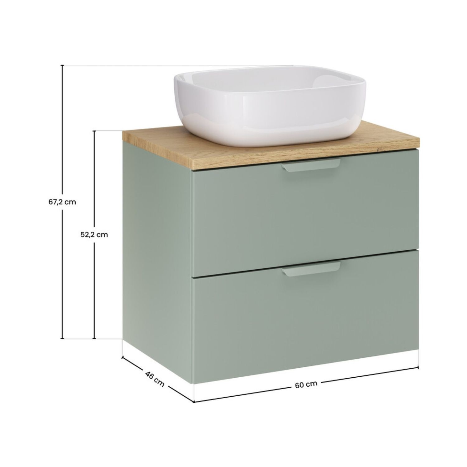 Apportez élégance et fonctionnalité à votre intérieur avec cet ensemble de salle de bain OSTER 60 cm, composé d’un meuble sous vasque vert sauge à tiroirs, d’un plan pour vasque aspect chêne clair et d’une vasque à poser en céramique blanche.