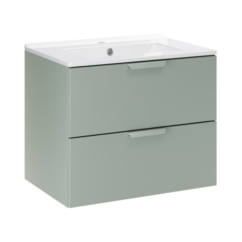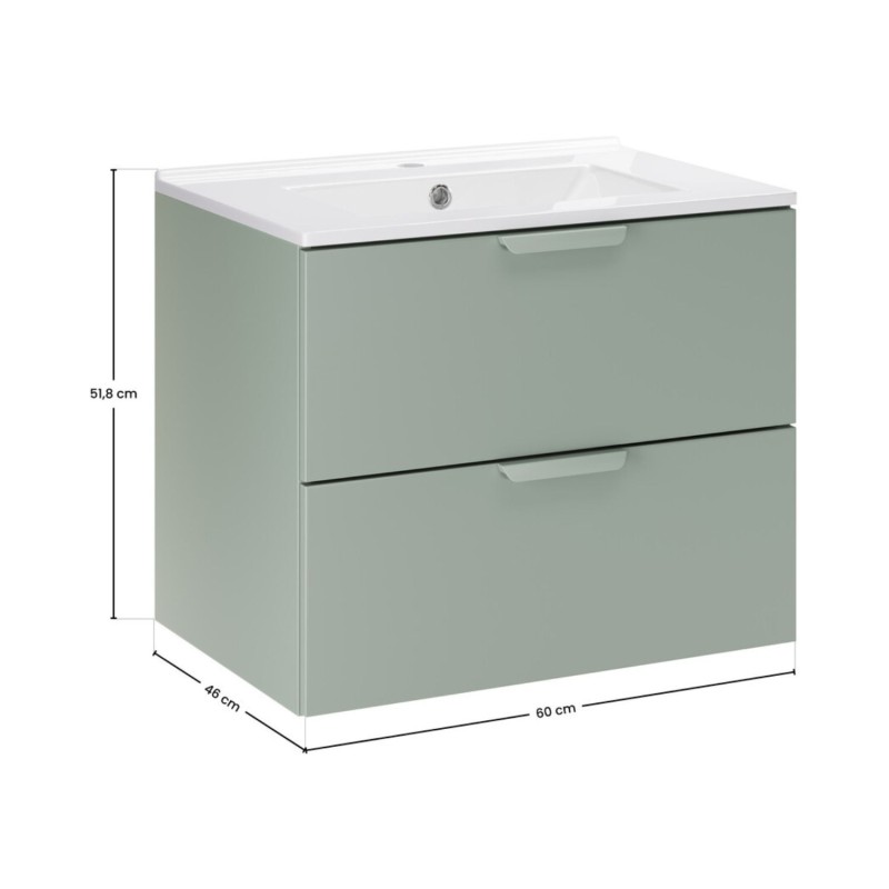 Apportez une touche moderne et fonctionnelle à votre intérieur avec cet ensemble de salle de bain OSTER 60 cm, composé d’un meuble sous vasque vert sauge à tiroirs et d’une vasque encastrée en céramique blanche.