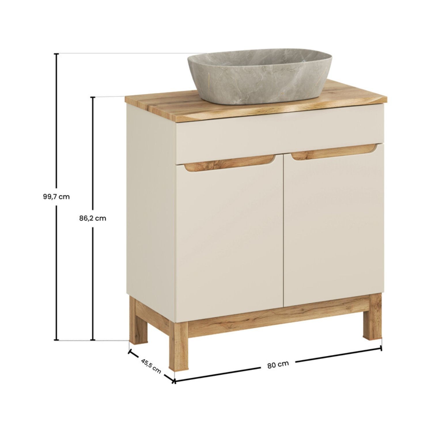 | Dimensions des éléments (en cm) | 1 meuble sous vasque 2 portes : 80x84x46 + 1 plan pour vasque biseauté : 80,6x2,2x47,5 + 1 vasque à poser : 50,5x13,5x38,5 |