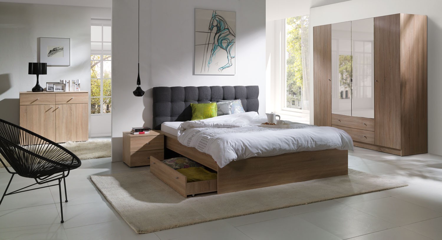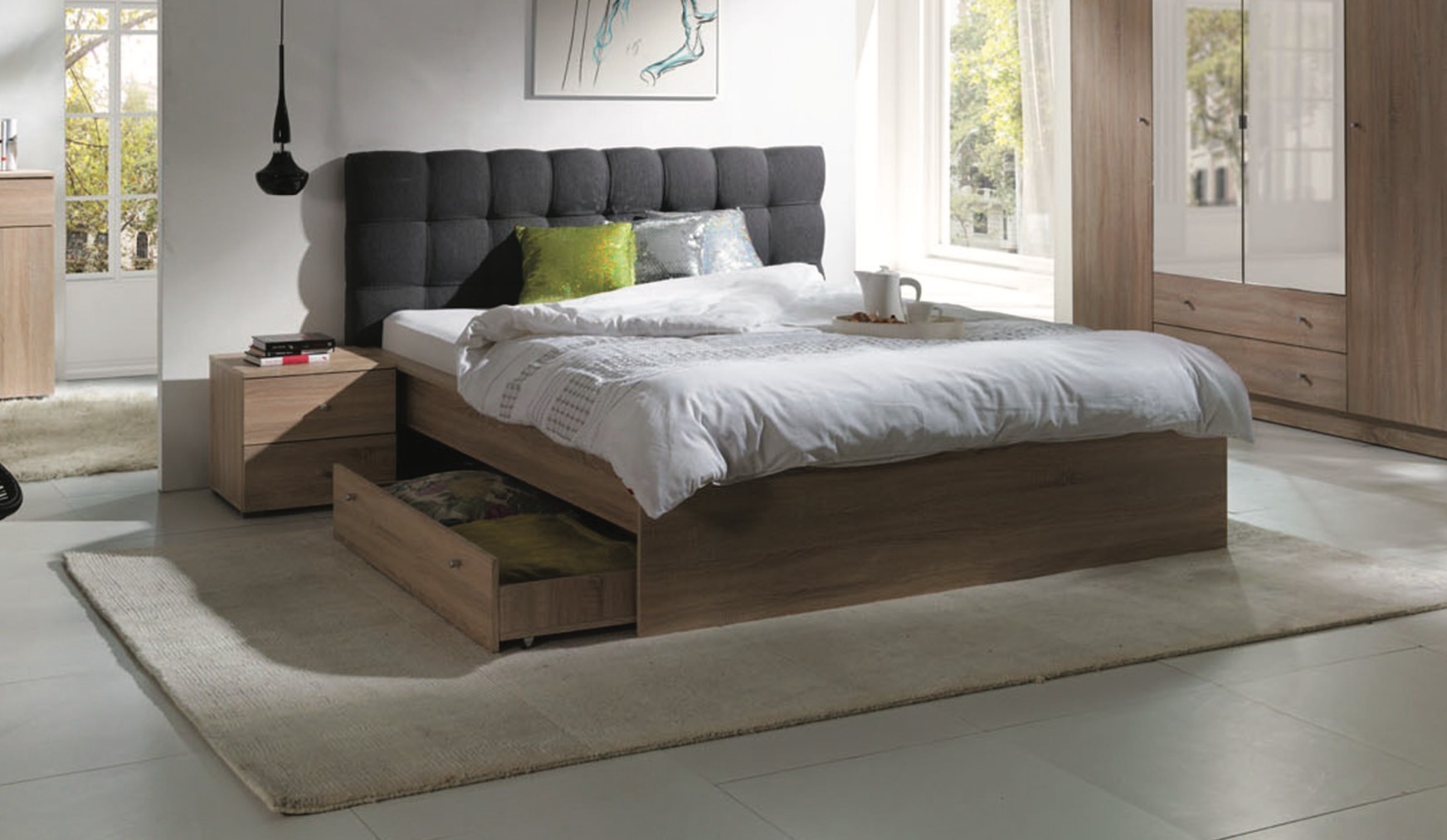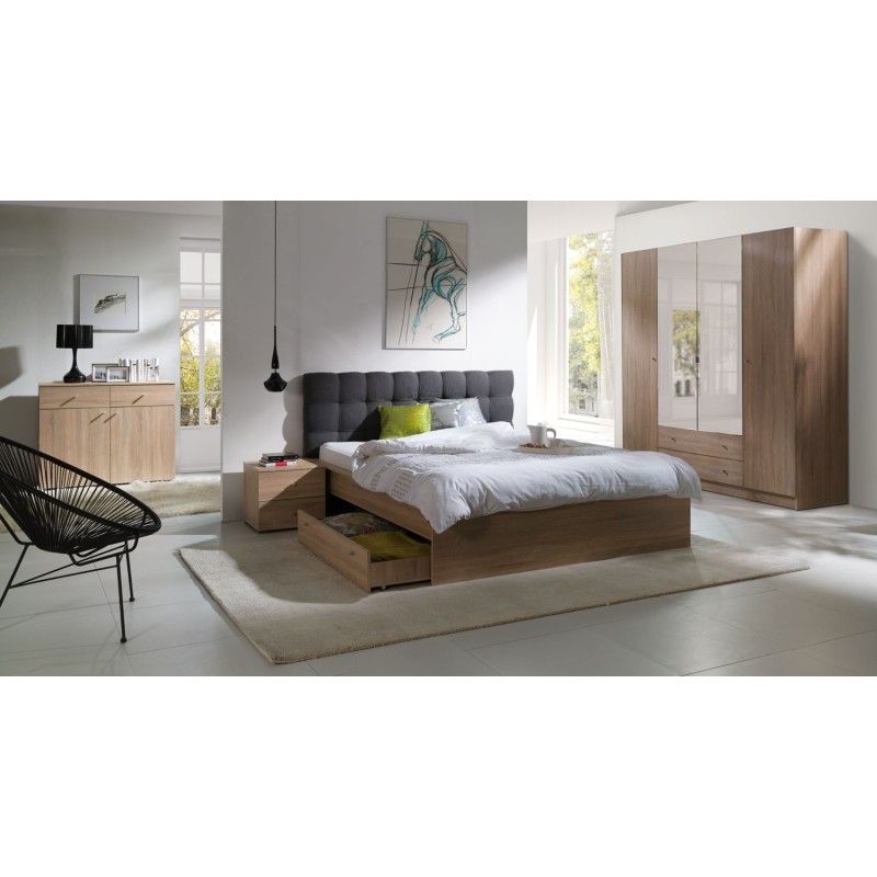 Cet ensemble lit est idéal pour optimiser votre espace tout en conservant un maximum de confort. Le tiroir de rangement sur roulettes permet de stocker facilement vos affaires, parfait pour les petits espaces. Les deux chevets offrent un rangement pratique à portée de main, tandis que la tête de lit capitonnée ajoute une touche de confort et d’élégance. Son design chaleureux en chêne sonoma crée une ambiance accueillante et intemporelle.