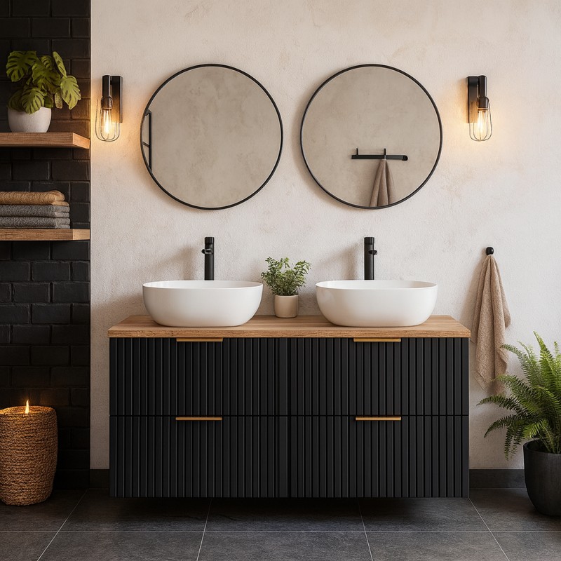 Avec ses façades noir mat et son plan pour vasque en finition chêne wotan, cet ensemble NOXERA combine modernité et chaleur naturelle. Les lignes sobres et contrastées s’intègrent parfaitement dans les salles de bain contemporaines tout en créant une ambiance chic et fonctionnelle.